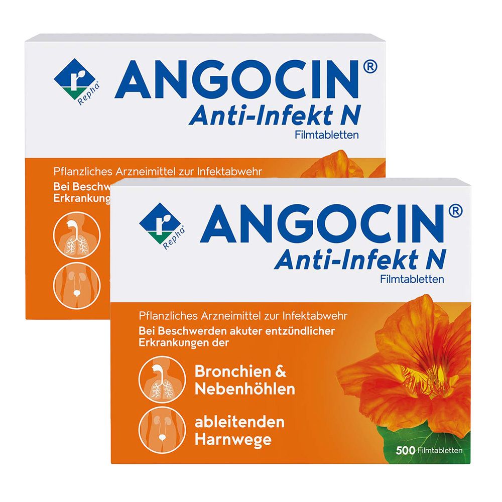 0,12 /St - Kategorie: Arzneimittel - Repha - GTIN:4150068929273 - PZN:06892927 - Pflanzliches Arzneimittel zur InfektabwehrANGOCIN Anti-Infekt N ist ein pflanzliches Arzneimittel aus Kapuzinerkresse und Meerrettichwurzel und wird eingesetzt zur Besserung der Beschwerden bei Infekten der Atem- und Harnwege.ANGOCIN Anti-Infekt N das Wichtigste auf einen Blick:Kapuzinerkresse und Meerrettich enthalten als Wirkstoff die sogenannten Senföle.Senföle wirken antientzündlich und lindern die typischen Symptome bei Atem- und Harnwegsinfekten.Durch die Ausscheidung über die Harn- und Atemwege liegt hier die höchste Wirkstoffkonzentration vor genau dort wo die Infektion die Symptome verursacht. ANGOCIN Anti-Infekt N ist zugelassen für Kinder ab n.Wieso kann ANGOCIN Anti-Infekt N sowohl bei einer Erkältung (grippaler Effekt) als auch bei einer Blasenentzündung helfen?Die Antwort darauf ist der einzigartige Wirkmechanismus. Die Senföle werden über die Atem- und Harnwege ausgeschieden, genau hier befinden sich die Bakterien oder Viren, die die Infektion ausgelöst haben und eine Entzündung der umliegenden Schleimhäute verursachen.Hier liegen die Senföle hochkonzentriert vor und können so bei einer Erkältung und einer Blasenentzündung (Harnwegsinfekt) ihre Wirkung entfalten und die Beschwerden lindern. Pflichttext Fachkreise ANGOCIN Anti-Infekt N ANGOCIN Anti-Infekt NAnwendungsgebiete: Zur Besserung der Beschwerden bei akuten entzündlichen Erkrankungen der Bronchien, Nebenhöhlen und ... Dieses Angebot ist eine Standard-500-Stück-Packung von einer großen Online-Apotheke. ![]() Angocin Anti Infekt N Filmtabletten 500 St
