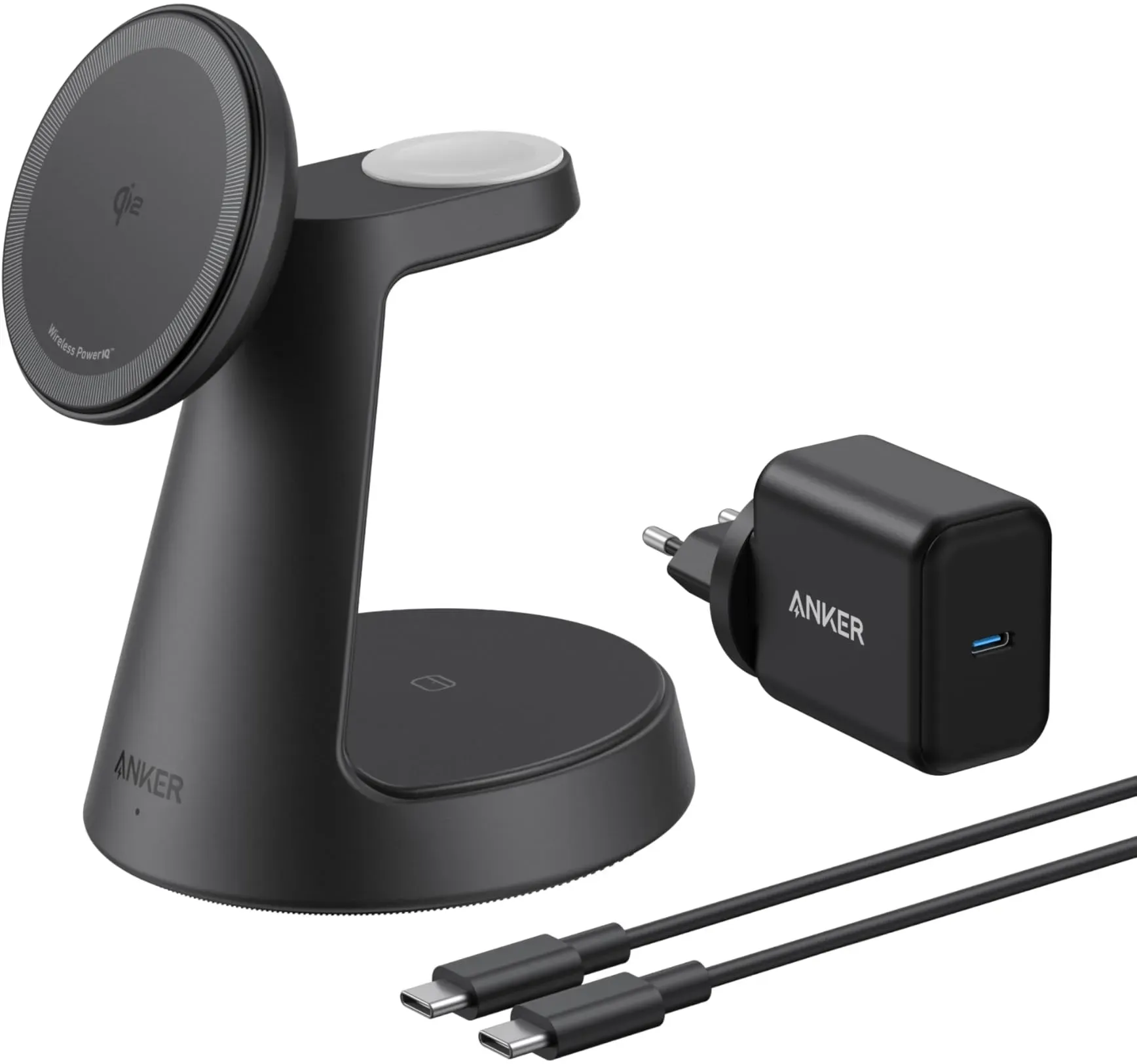 Auf Lager Versand durch AmazonAnker MagGo 3-in-1 Ladestation, Qi2 zertifizierter 15W kabelloser Ladeständer, MagSafe kompatibel, Apple Watch Ladegerät, Für iPhone 17/16/15/14, AirPods, Apple Watch 9 (Mit 40W USB-C Netzteil)