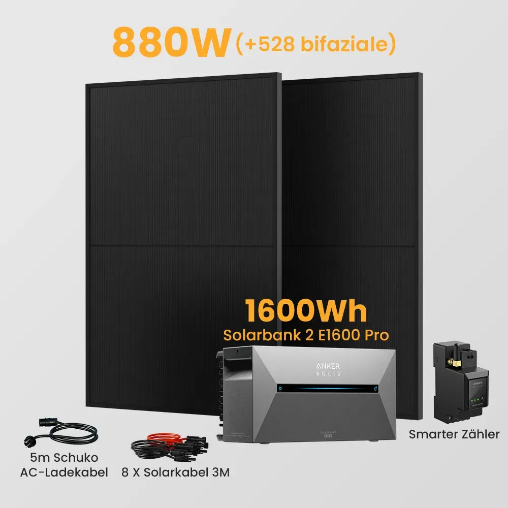 Zustand: Neu - Netzgebundene Systeme Netzgebundene Photovoltaikanlagen - Anker - A17C1 - EAN: 0194644055677 - JÄHRLICH 392€ STROMKOSTEN GESPART: 4 MPPT-Routen unterstützen 2400W, und du kannst Erweiterungsakkus bis zu 9,6kWh Kapazität hinzufügen. All diese Energieeinsparungen führen zu einer massiven Reduzierung deiner Stromrechnung um bis zu 392€. ANTI-ENERGIEVERSCHWENDUNG: Erreiche echte Effizienz mit dem Anker SOLIX Smarten Zähler, der den Stromverbrauch in Echtzeit überwacht, mit einer Reaktionszeit von nur 3 Sekunden. LANGLEBIGE LEISTUNG: Die Solarbank 2 Pro versorgt dein Zuhause 1 lang mit 6.000 Ladezyklen (1 Hersteller ). Solarpanels halten 3 (1 Hersteller ) und bleiben mit IP65 (IP68 für Panels) wasser- und staubdicht, auch bei -20°C Kälte. 1000W NOTSTROMVERSORGUNG: Halte wichtige Geräte mit der 1000W AC-Steckdose auch während eines Stromausfalls am Laufen. IM LIEFERUMFANG: Solarbank 2 E1600 Pro, 2× RS40T Solarpanel, 5m Schuko-Ladekabel, 8× 3m Solarpanel-Verlängerungskabel, Installationszubehör, Anleitungshandbuch. Sets aus Solarbank und Zubehör (Modul, Zähler, etc), werden in mehreren Lieferungen verschickt. Die Auslieferung erfolgt innerhalb des angegebenen Zeitraums. - Verkäufer: Anker SOLIX im amazon.de Marketplace Ein umfassendes Balkonkraftwerk-Set mit 1600Wh Solarbank und leistungsstarken bifazialen Solarmodulen, inklusive Smart Meter, für eine effiziente Energiegewinnung. ![]() ![]() Anker Solix Solarbank 2 E1600 Pro 1600Wh Balkonkraftwerk Set, 880/890/1760/1780W Bifaziale Solarmodule, mit Smarter Zähler