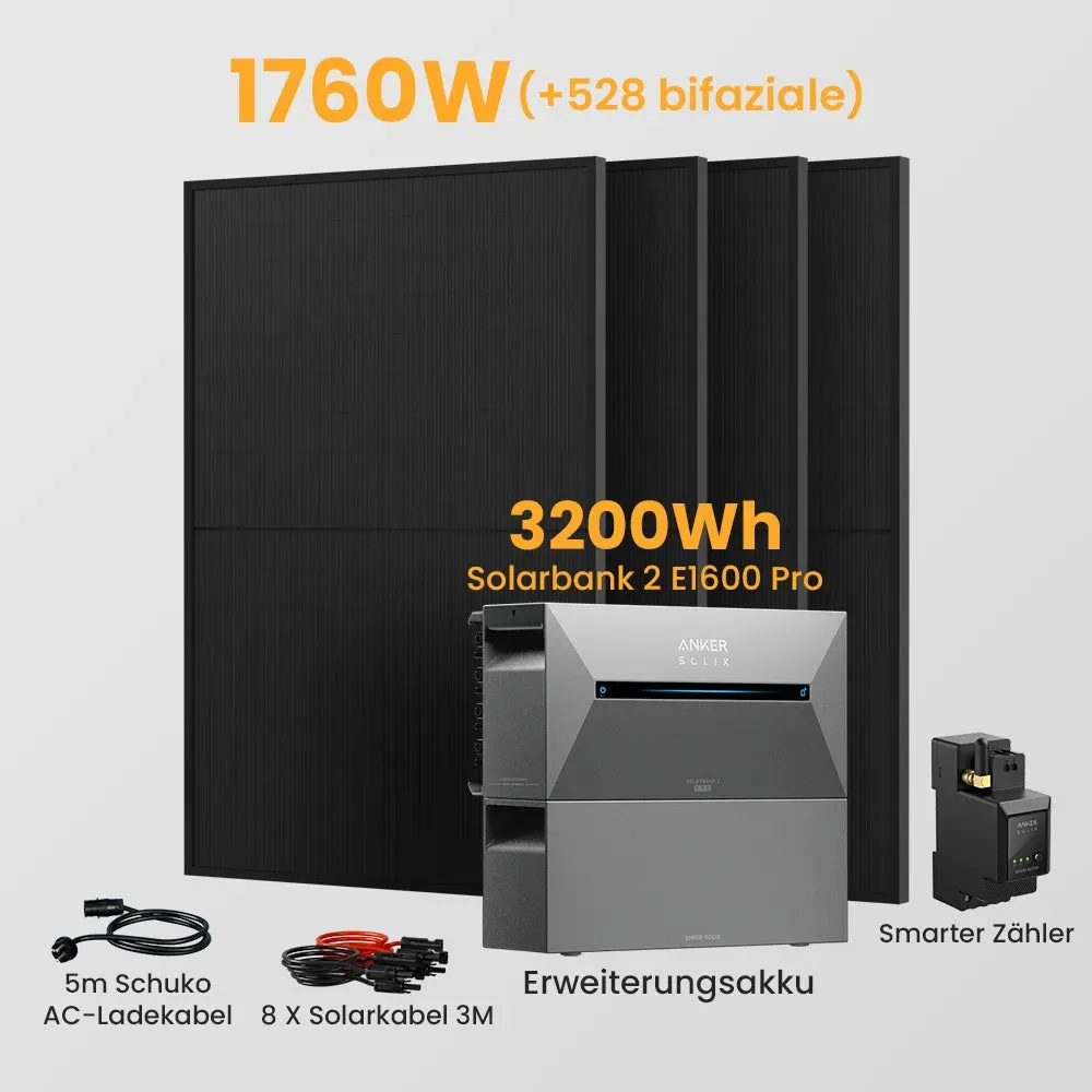 Kategorie: Stromspeicher - Anker - GTIN:0194644036058 - Solarmodule und Zubehör, einschließlich des Smartmeters, werden komplett getrennt in verschiedenen Lieferungen versendet. Die Lieferzeiten richten sich nach der Solarbank 2 E1600.. Wichtig: In diesem Angebot wird davon ausgegangen, dass Sie gemäß 12 Abs. 3 UStG berechtigt sind, das angebotene Produkt zu einem reduzierten MwSt.-Satz von 0 % zu erwerben. Bitte beachten Sie, dass dieser reduzierte Mehrwertsteuersatz nur für Endkunden (B2C Kunden) gilt. Für Geschäftskunden (B2B Kunden) behalten wir uns das Recht vor, Ihnen im Nachhinein eine Rechnung mit dem regulären MwSt.-Satz von 19 % per E-Mail zuzustellen.. Sofort lieferbar - In 3-7 Tagen bei Ihnen Zuhause. Das Set beinhaltet:. Anker SOLIX Solarbank 2 E1600 Pro. 4 x JA Solar Solarmodule (435 Black Frame/440 Full Black). 1x Smarter Zähler. 8x 3m Solarpanel-Verlängerungskabel. 1x 5m Schuko AC-Ladekabel. 1x Erweiterungsakku. Anker SOLIX Solarbank E1600 Pro:. Anker SOLIX Solarbank 2 E1600 Pro Solarstromspeicher Die All-in-One-Solarlösung. Maximale Energieeffizienz ohne Verschwendung. Einfach zu installieren keine Bohrungen, minimale Verkabelung. Modular und anpassbar an Ihre Bedürfnisse. Zuverlässiger Backup-Strom bei Stromausfällen. Langlebig und robust für 1 Energie. Einfache Steuerung mit der Anker-App - 1849,00 Euro bei Powerness.de - gefunden von billiger.de Dieses Angebot für 2538 Euro bietet ein großes Balkonkraftwerk-Set mit 4800/6400Wh Speicher und 4x 440Wp bifazialen Solarmodulen, ideal für Nutzer mit hohem Energiebedarf. ![]() Powerness. de