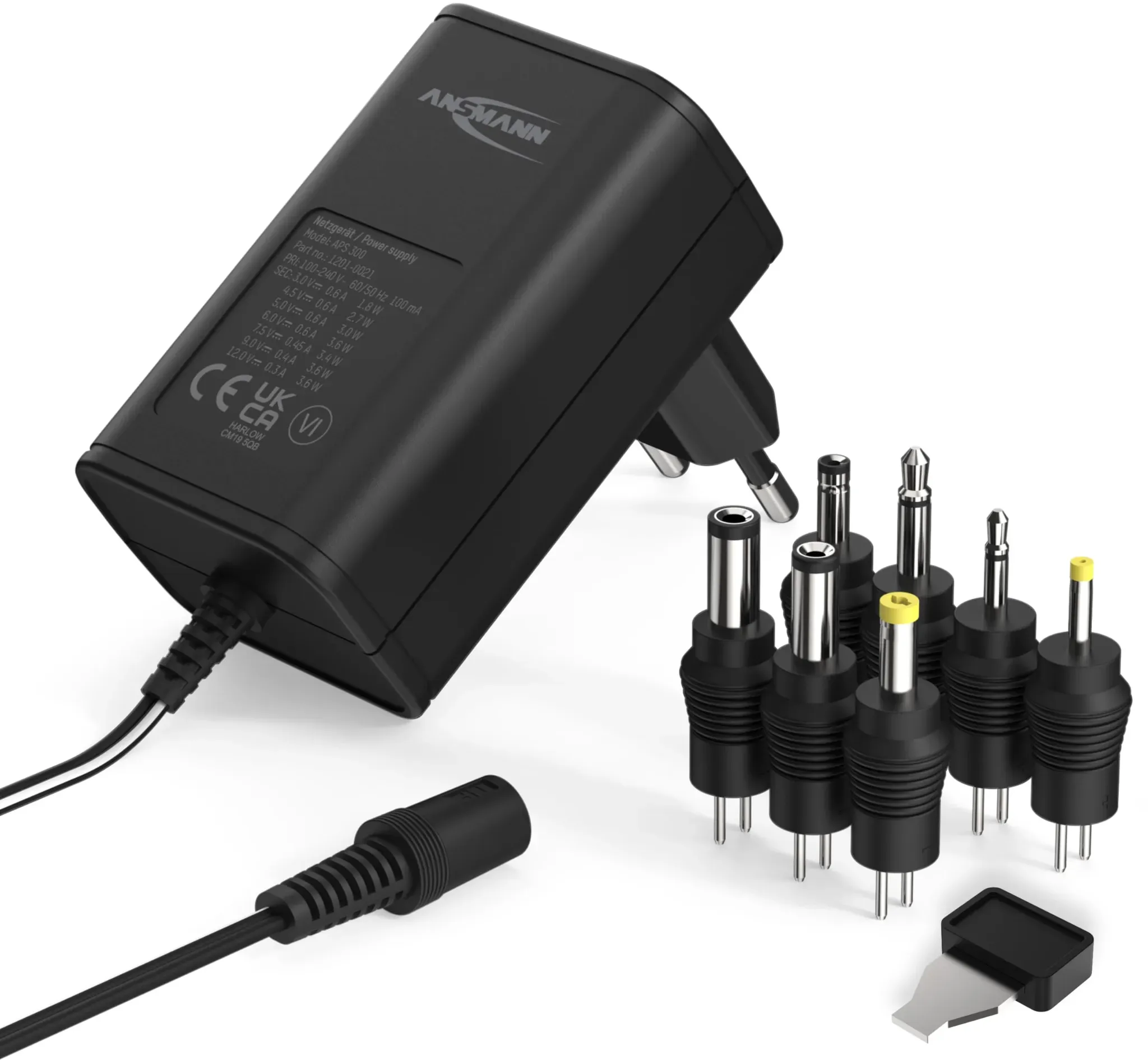 Ansmann - EAN: 4013674164073 - Universal-Netzteil für eine Vielzahl von GerätenMit dem APS 300 haben Sie die Möglichkeit eine Vielzahl von Elektrokleingeräten wie Taschencomputer, Digitalkameras, Messgeräte, MP-3 Player, CD-Player etc. zu betreiben. Für beste Kompatibilität zu den vielen verschiedenen Geräten wird ein siebenteiliges Steckerset mitgeliefert. Die darin enthaltenen gebräuchlichen Klinken- und Hohlsteckern sorgen für ideale Kontaktierung. Ganz gleich welches Gerät betrieben werden soll.über einen Drehschalter, auf der Rückseite des Netzteils, kann die Ausgangsspannung eingestellt werden. Das APS 300 ist kurzschlussfest und spannungsstabilisiert. Geeignet für Verbraucher bis max 0,3. A, 3,6 W Leistung.weltweit einsetzbareinstellbarer LadestromkurzschlussfestspannungsstabilisiertInkl. 7- teiliges SekundärsteckersetTechnische Features:Eingangsspannung: 100 - 240 V AC, 50/60 HzAusgangsspannung: 3 - 12 VAusgangsstrom: max. 300 mALeistung: 3,6 WKabellänge: 1,8 mErP: lvl 6 - bei reichelt.de - aus Yadore Produktdaten Dieses Angebot im Amazon Marketplace ist mit 10.71 Euro sehr attraktiv und beinhaltet 7 Adapterstecker. ![]() ![]() ANSMANN APS 300 Universal Stecker Netzteil 12V inkl. 7 verschiedende Adapter Stecker - Netzstecker bis max. 600mA - zur Stromversorgung vieler Elektrokleingeräte von 3-12 Volt regelbar