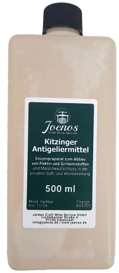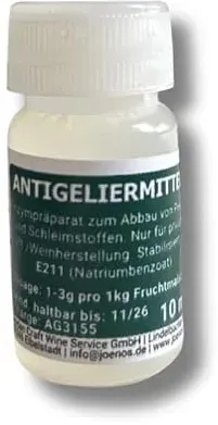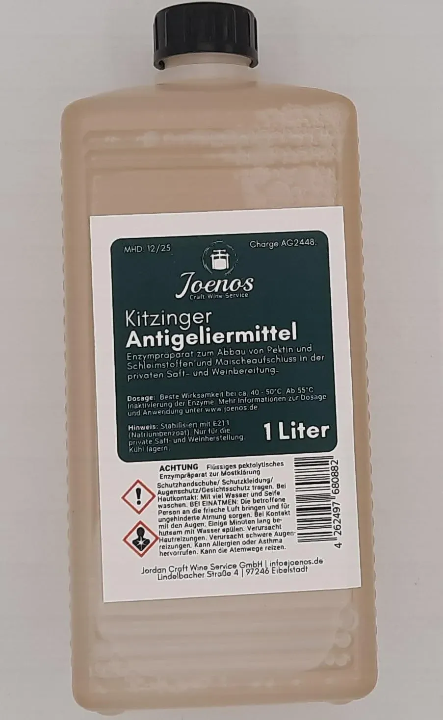 39,90 /l - Kategorie: Medizinischer Bedarf - paul arauner gmbh + co. kg - GTIN:4262497680905 - 'Kitzinger Antigeliermittel' (Alternative Arauner Antigel)Kitzinger Antigeliermittel ist ein Enzym-Präparat zum Abbau von Pektin und Schleimstoffen bei der Entsaftung von Früchten. Fruchtmaischen sind häufig schwer abpressbar. Die Ursache sind Pektine und Schleimstoffe! Nach dem Zerkleinern der Früchte gibt man aus diesem Grund nach dem Mahlen der Früchte Antigel zu. Bei saftarmen Früchten auch Wasser und rührt alles gut ein. Neben der Dosagemenge spielen die Temperatur und Einwirkzeit eine große Rolle. Im Kitzinger Weinbuch ist dies gut erklärt. Antigel Einwirkzeiten und Wirkung: unter 10 C = kaum Pektinabbau um 15 C = ca. 15-20 Std.um 20 C = ca. 10 Std.um 25 C = ca. 7-10 Std.um 30 C = ca. 5 Std.um 40 - 50 C = 2-3 Std.über 55 C = Inaktivierung (Zerstörung) des Enzyms Dosierungstabelle für die Zugabe von Antigeliermittel: Für je 1kg MaischeTrauben weiß, Sauerkirschen, Pfirsiche 1,0 bis 1,5gHeidelbeeren, Johannesbeeren rot und weiß, Süßkirchen, Holunderbeeren 1,5 bis 2,0gBrombeeren, Erdbeeren, Himbeeren, Trauben rot, Schlehen 2,0 bis 2,5gJohannisbeeren schwarz, Stachelbeeren, Pflaumen, Mirabellen, Zwetschgen 2,5 bis 3,0g Wichtig: Maische abgedeckt stehen lassen. Nach Anbruch sofort aufbrauchen! Hinweise: Mit Benzoesäure flüssig konserviert. Nur für den privaten Gebrauch gesetzlich erlaubt.Verwendung Behandlungsmittel: Antigeliermittel - 19,95 Euro bei Kaufland.de - gefunden von ... Dieses 1 Liter Antigeliermittel von Joenos Craft Wine ist eine kostengünstige Option für Großverbraucher. ![]() ![]() Antigel Antigeliermittel - Pektinase 1 eBay Liter - Joenos Craft Wine