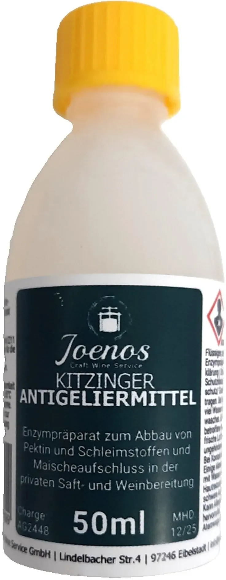 Kategorie: Sonstiger Hundebedarf - joenos - VERWENDUNG: Antigel Dry ist ein spezielles Pulver zur Verhinderung der Kristallisation in Säften und anderen Getränken DOSIERUNG: Einfach in etwas Saft oder Wasser auflösen und der restlichen Flüssigkeit beimischen INHALT: Kompakte 5g Packung, ideal für die genaue Portionierung bei der Getränkeherstellung QUALITäT: In Deutschland hergestellt unter strengen Qualitätsstandards für optimale Wirksamkeit Exclusiv Handels & Dienstleistung GmbH,Aachen Kitzinger Antigel Antigeliermittel ist ein Enzym-Präparat zum Abbau von Pektin und Schleimstoffen bei der Entsaftung von Früchten. Der Vorteil am DRY Antigeliermittel (trockenes Produkt in Pulverform) ist die Haltbarmachung ohne Konservierungsstoffe. Warum braucht man Antigel? Antigel Einwirkzeiten und Wirkung: unter 10 C = kaum Pektinabbau um 15 C = ca. 15-20 Std. um 20 C = ca. 10 Std. um 25 C = ca. 7-10 Std. um 30 C = ca. 5 Std. um 40 - 50 C = 2-3 Std. über 55 C = Inaktivierung (Zerstörung) des Enzyms Dosage: Ca. 1 - 2 g pro 10 Liter Saft. 5g reichen also für 25 - 50 Liter Saft aus. Bei Säften / Mosten mit hohem Pektin kann die Dosage erhöht werden. Eine höhere Dosage verkürzt auch die Klärzeit. Hinweis: Maische abgedeckt stehen lassen. Nach Anbruch sofort aufbrauchen! - 8,95 Euro bei Amazon Marketplace Kitchen - gefunden von billiger.de Dieses 10ml Enzym-Präparat von Joenos Kitzinger ist eine gute Option für kleinere Anwendungen und zum Testen. ![]() ![]() joenos Kitzinger Antigeliermittel - Antigel Enzym-Präparat zum Abbau von Pektin und Schleimstoffen bei der Entsaftung von Früchten von Exclusiv Handel, Aachen 10 ml
