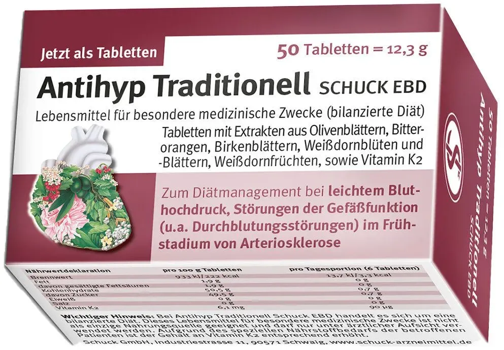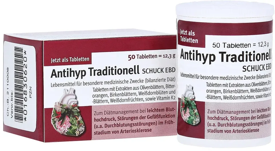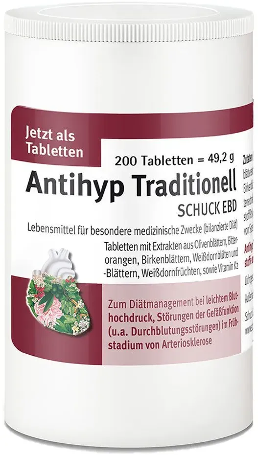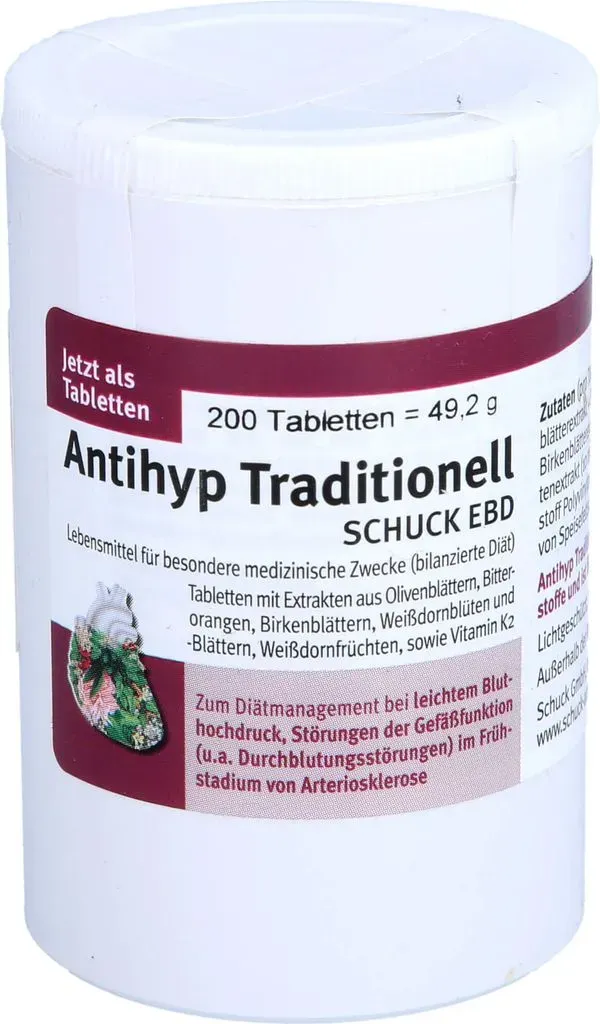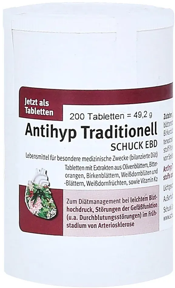 ? Was ist Antihyp Schuck?Antihyp Schuck ist ein pflanzliches Präparat, das verschiedene Wirkstoffe wie Olivenblätterextrakt, Birkenblätterextrakt, Mistelkrautextrakt und Weißdornextrakt enthält. Es wird als Nahrungsergänzungsmittel oder Arzneimittel angeboten und ist rezeptfrei erhältlich.