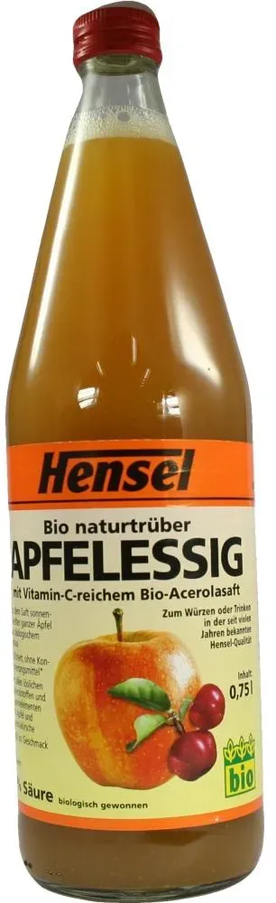 EAN: 4006309042303 - Hensel Bio naturtrüber Apfelessig aus dem Saft sonnengereifter äpfel aus biologischem Anbau unfiltriert und ohne Zusätze nicht pasteurisiert mit allen löslichen Mineralstoffen und Spurenelementen des Apfels mild im Geschmack Hensel Bio naturtrüber Apfelessig ist besonders wertvoll durch seine Naturtrübe - nicht nur im Salat. Nicht geklärt enthält er viele Ballaststoffe, Vitamine und Mineralstoffe. Belebter Start in den Tag! Trinken Sie täglich nach dem Aufstehen ein Glas dieser Mischung: 1 Esslöffel Hensel Bio naturtrüber Apfelessig in einem Glas Wasser verdünnt und mit 1 Esslöffel Honig gesüßt. Gut umrühren, in kleinen Schlucken langsam trinken. - bei die-beraterapotheke.de - aus Yadore Produktdaten ![]() ![]() SALUS Hensel Apfelessig Naturtrüb M. 5% Acerola Bio 750 ML
