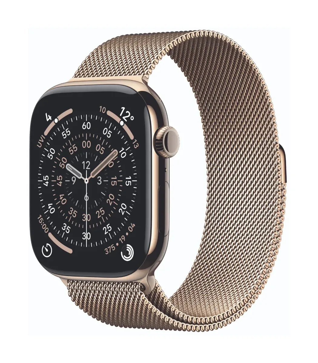 Kategorie: Smartwatches - Apple - GTIN:0195950629453 - Die ultimative Watch für deine Gesundheit Mit Hypertonie-Erkennung und Schlafindex Gehäusematerial: - Armbandmaterial: Edelstahl Gehäusefarbe: - Armbandfarbe: beige - 849,00 Euro bei computeruniverse.net - gefunden von billiger.de Ein Premium-Angebot für eine Apple Watch Series 11 mit GPS + Cellular, 46mm Gold Titanium Gehäuse und Gold Milanese Loop. ![]() ![]() Apple Watch Series 11 GPS + Cellular 46mm Gold Titanium Milanese Loop gold M/L
