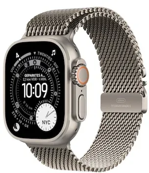 Kategorie: Smartwatches - Apple - GTIN:0195950611007 - (') Touch OLED Display 42 h Ladefunktion: SchnellladungInduktion Gehäusematerial: Titan - Armbandmaterial: Titan Gehäusefarbe: Schwarz - Armbandfarbe: schwarz - 965,00 Euro bei computeruniverse.net - gefunden von billiger.de Dieses Angebot ist für Nutzer, die ein Naturtitan-Gehäuse mit einem hochwertigen Naturtitan Milanese Loop Armband in Large suchen. ![]() ![]() Apple Watch Ultra 3 GPS + Cellular 49mm Natural Titanium Case with Natural Titanium Milanese Loop - Large