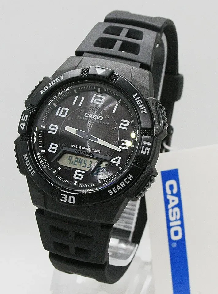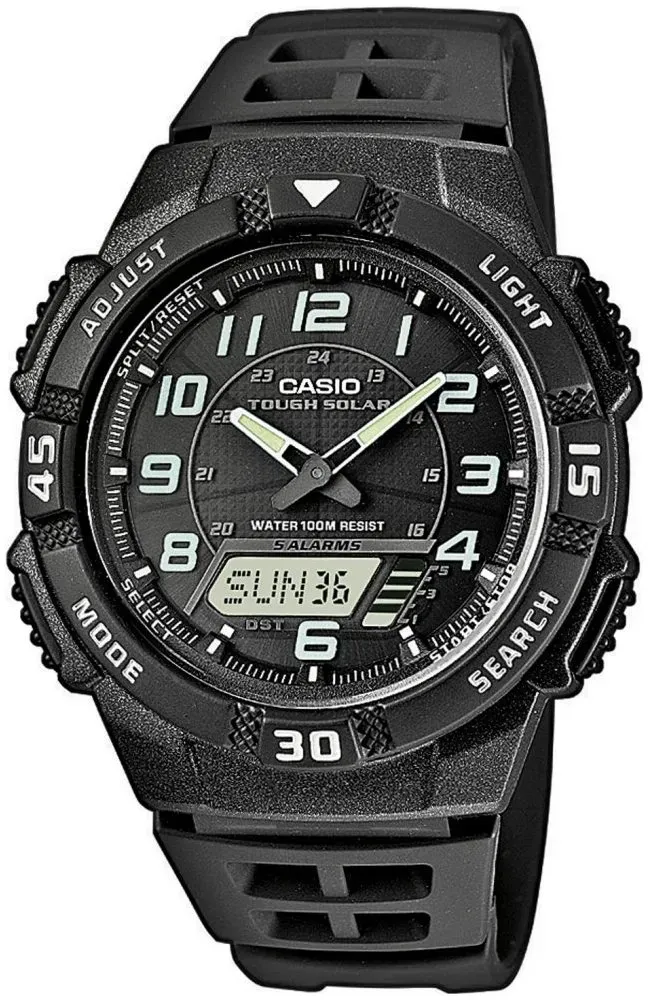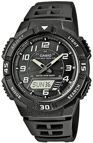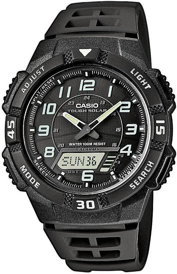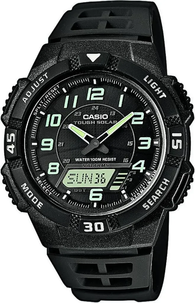 Casio - EAN: 4971850948179 - Das vollständig schwarz gehaltene Design verleiht dieser Uhr der Marke Casio Collection Men einen lässigen und sportlichen Touch. Das Gehäuse und Armband aus Kunstharz und das gewölbte Glas sorgen für eine gute Haltbarkeit. Zur unabhängigen und umweltfreundlichen Energieversorgung funktioniert dieses Modell mit Solarenergie. Dank ihrer Wasserdichtigkeit bis zu einer Tiefe von 100 Metern eignet sich diese Uhr zudem perfekt für den Tauchsport. - bei voelkner.de - aus Yadore Produktdaten Kaufland.de listet die Uhr für 49.36 Euro, was ein wettbewerbsfähiger Preis für eine Solar Ana-Digi Sportuhr ist. ![]() ![]() Casio Collection Uhr AQ-S800W-1BVEF Solar Ana-Digi Sportuhr schwarz - Schwarz/Schwarz