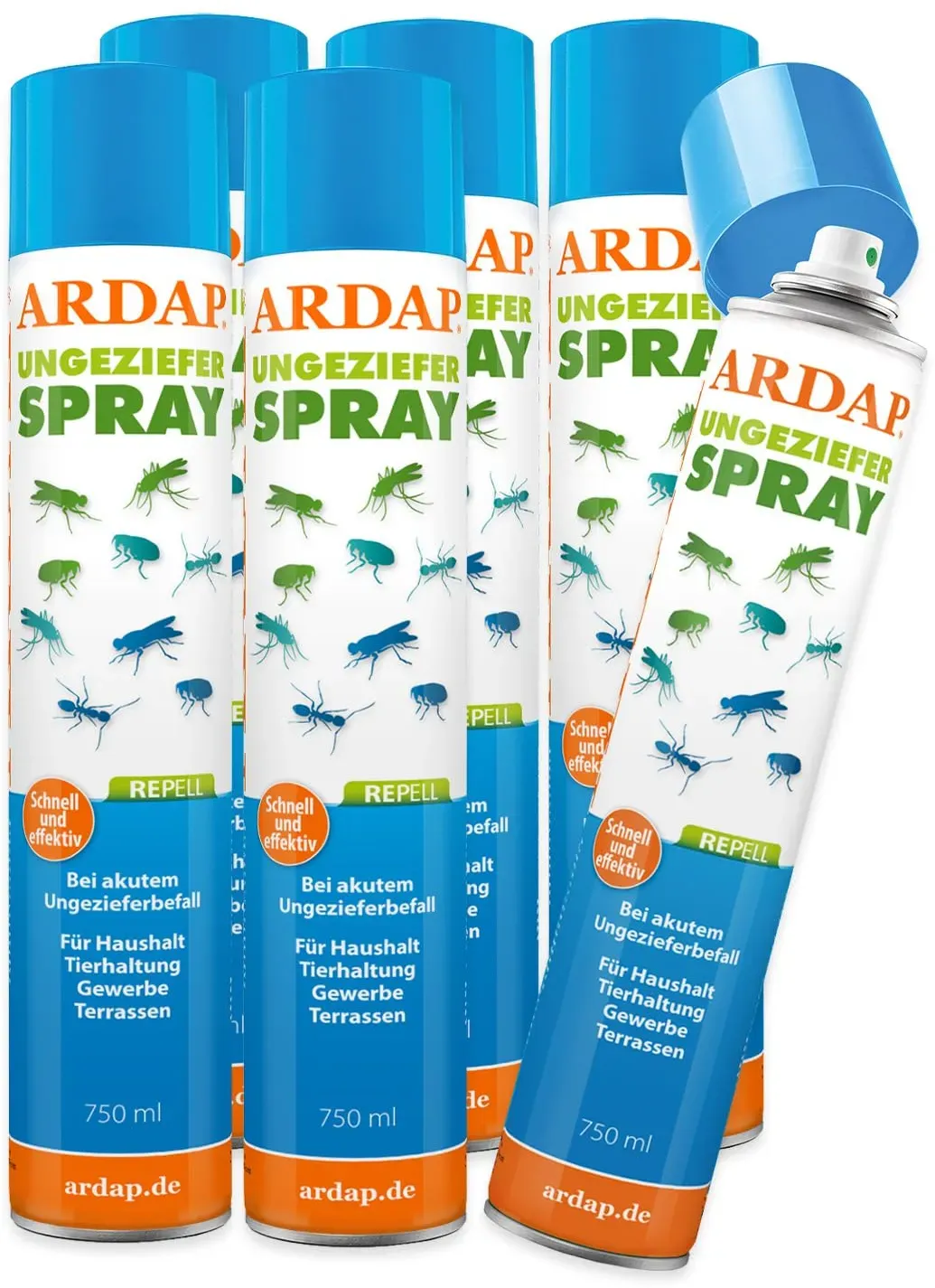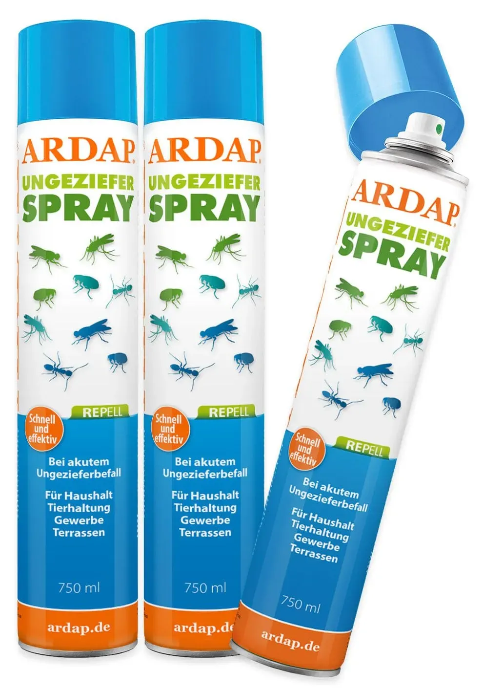Zusammengefasst sollten Sie beim Kauf auf die 750-ml-Größe achten, da diese ein gutes Preis-Leistungs-Verhältnis bietet. Achten Sie auf die korrekte Anwendung und Sicherheitsvorkehrungen. ARDAP Ungezieferspray ist beliebt wegen seiner breiten Wirksamkeit, natürlichen Inhaltsstoffe und der langanhaltenden Wirkung. Für die Suche im Meta-Preisvergleich können Sie direkt nach ARDAP Ungezieferspray 750 ml suchen. Jetzt live Suche nach ardap ungezieferspray starten! Empfohlene Ardap ungezieferspray Angebote*Durch Käufe über Links zu Händlern kann diese Website eine Provision erhalten, u.a. durch das eBay Partner Network und das AmazonPartnerNetDieses 200ml Spray ist die günstigste Option und eignet sich gut für den Einstieg oder für kleinere Anwendungen. ![]() Ardap Care GmbH ARDAP Repell Ungezieferspray, 200ml