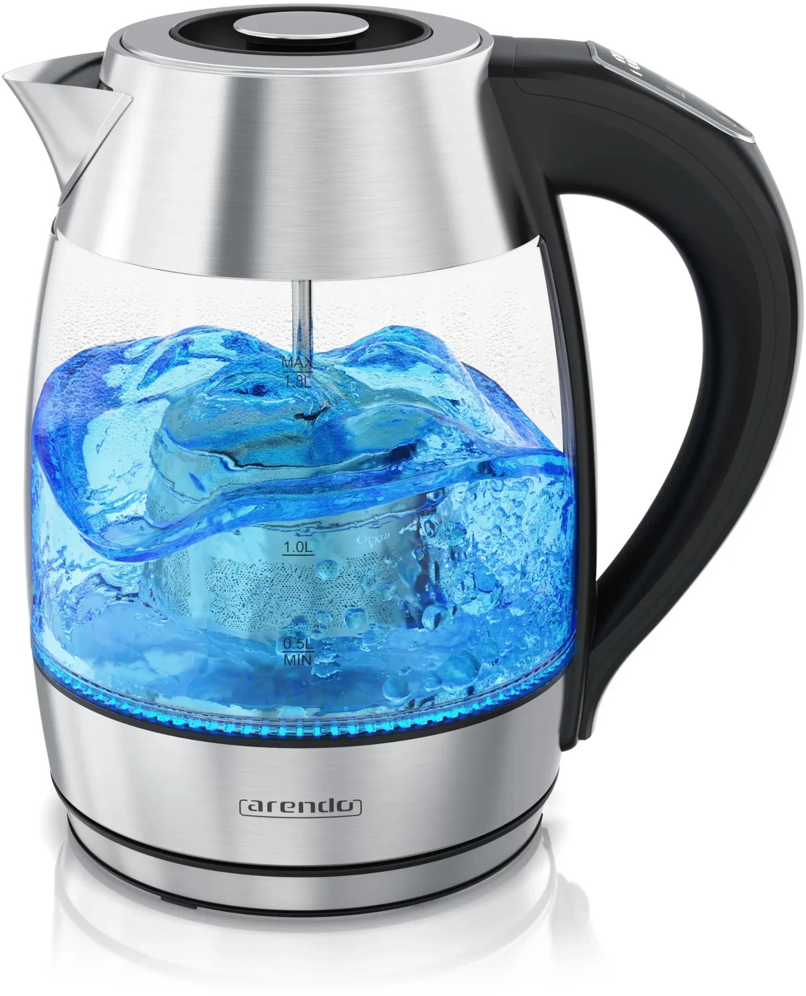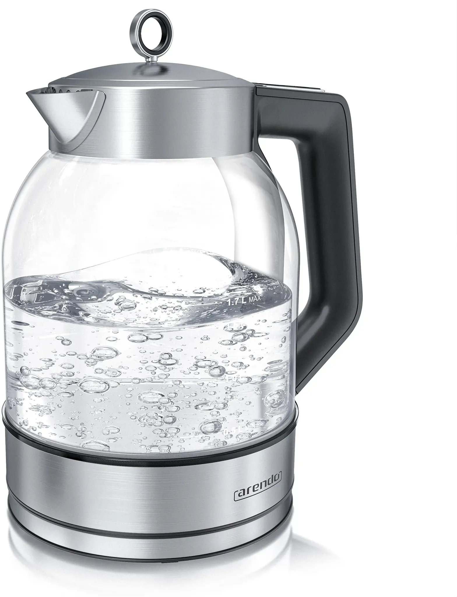 Verfügbarkeit: Auf Lager - Kategorie: Wasserkocher - Arendo - GTIN:4062861799758 - 1,7 LITER GROßER WASSERKOCHER MIT 2000 WATT LEISTUNG. Der GLASS CONTROL erhitzt große Wassermengen in kürzester Zeit und hält sie über die Warmhaltetaste bis zu 30 Minuten auf Temperatur. Ideal für Teeaufgüsse und heiße Getränke in großer Runde. | BPA-frei | 05567 SET-DIREKTWAHLTASTE FüR KOMFORTABLE BEDIENUNG: schnelle und einfache Anwahl der Zieltemperaturen 40°C, 60°C, 80°C und 100°C. | Wahlweise feinstufiges Einstellen der Temperatur mit den +/- Tasten in 5°-Schritten von 40°C bis 100°C. PRäZISE TEMPERATURMESSUNG: Dank Zwischenmessung per Temperaturfühler wird die von Ihnen angewählte Zieltemperatur beim Erhitzen schnell und präzise erreicht. Den Temperaturanstieg können Sie anhand der Zahlen auf der Anzeige mitverfolgen. UMFASSENDE AUSSTATTUNG: Temperaturen wählbar in 5° Schritten von 40°C bis 100°C; oder Direktwahl 40°C / 60°C / 80°C/ 100°C per SET-Taste | Füllstandsmarkierung | Heizelement im Boden ermöglicht eine leichte Reinigung | Warmhaltefunktion 30 min. | automatische und manuelle Abschaltung | Cool-Touch-Griff | Trockengehschutz, überhitzungsschutz | Summer, abschaltbar (Ausnahme: START-Ton) | weiße LED-Anzeige | automatische Displayabschaltung | 360° Kontaktsockel ABMESSUNGEN: Höhe 27,5 cm x Breite mit Griff 23 cm / ohne Griff 16 cm; Kabellänge: 70 cm | GEWICHT: 1042 g Wasserkocher, 220 g Basis | LIEFERUMFANG: Arendo Wasserkocher ... Dieser Wasserkocher überzeugt mit einer Warmhaltefunktion von 30 Minuten und einem modernen Design aus Borosilikatglas und Edelstahl. ![]() ![]() Arendo - Glas Wasserkocher mit Temperatureinstellung - Warmhaltefunktion 30min - 1,5 Liter Füllmenge - Borosilikatglas - Basisstation aus Edelstahl - Modernes Design