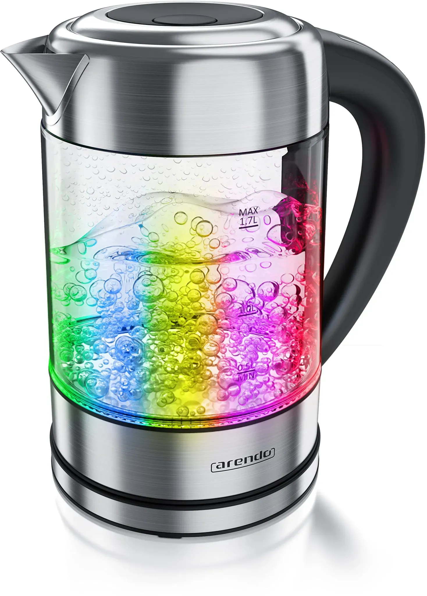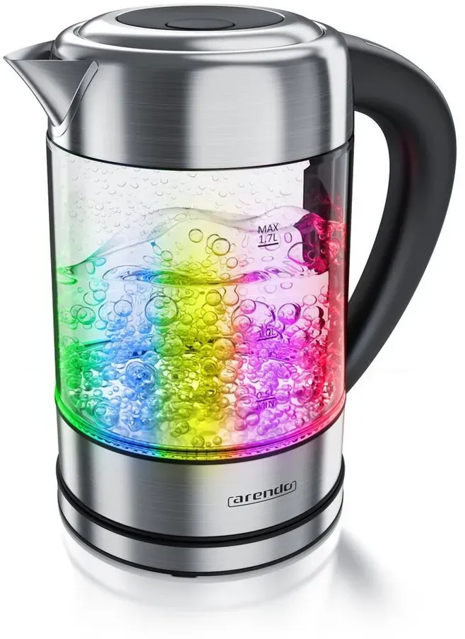 Verfügbarkeit: Auf Lager - Kategorie: Wasserkocher - Arendo - GTIN:4062861850381 - PERFEKT ZUBEREITETER TEE AUF KNOPFDRUCK: Der Arendo BEST TEA überzeugt mit einem herausnehmbaren Edelstahl-Teesieb, das dank integriertem Knauf bequem abgesenkt und angehoben werden kann ideal zum Ziehenlassen direkt im Gerät. Die exakte Temperaturanzeige in °C oder °F ermöglicht das punktgenaue Erhitzen für empfindliche Teesorten wie grünen oder weißen Tee. | Ausguss mit Kalkfilter für besten Geschmack. | 307561 SICHER, STARK UND INTELLIGENT: Mit 2200 Watt bringt der Wasserkocher bis zu 1,8 Liter Wasser schnell zum Kochen. Dank automatischer und manueller Abschaltung, Trockenlaufschutz, überhitzungsschutz und akustischem Signal bietet er höchste Sicherheit im Alltag. Die Warmhaltefunktion sorgt dafür, dass dein Wasser die Zieltemperatur bis zu 2 Stunden lang hält ideal für längere Teesitzungen. FARBDARSTELLUNG DER TEMPERATUR: Die innovative LED-Beleuchtung visualisiert die aktuelle Wassertemperatur direkt im Glas: Weiß (bis 39 °C), Grün (4049 °C), Cyan (5059 °C) bis hinauf zu Rot (90100 °C). Insgesamt 7 Farben und Temperaturbereiche. So hast du jederzeit im Blick, wann das Wasser die ideale Temperatur für dein Getränk erreicht hat ganz ohne Thermometer. FüR DEN BESTEN GESCHMACK: Der Kalkfilter im Ausguss hält Schwebeteilchen zurück und trägt zum leckeren Genuss bei. Der Filter kann jederzeit ganz einfach entnommen und gesäubert werden. ... Die RGB-Beleuchtung und die schnelle 3-Minuten-Aufkochfunktion sind besondere Highlights dieses Modells. ![]() ![]() Arendo - Wasserkocher Edelstahl Glas mit Temperatureinstellung 1,7l - einstellbare Temperaturen 40° 70° 80° 90° 100 °C Warmhaltefunktion 3 Min Aufkochfunktion BPA-frei - RGB Beleuchtung