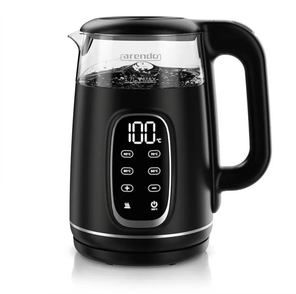 Auf Lager Versand durch AmazonArendo - Glas Wasserkocher mit Temperatureinstellung - Edelstahl - Doppelwand Design Cool Touch - Display im Gehuse - Kabellos - 2200 W - 1,7L ? berhitzungsschutz ? Warmhaltefunktion ? schwarz