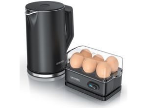 Zustand: Neu - Wasserkocher - Arendo Arendo Wasserkocher Maya - 6861681111 - EAN: 4062861829998 - HANDLICH, ELEGANT UND PRAKTISCH: Wasserkocher MAYA - Aus der Familie der beliebten und bewährten Retro-Kocher von Arendo. Sein asiatisches Design macht ihn zu einem echten Hingucker und die Füllmenge von 0,6 Liter ist ideal für eine Teezeremonie von bis zu 3 Personen. Zugleich bietet er die umfassende Funktionalität eines großen Gerätes. | BPA-frei | 306697 360° BASISSTATION MIT SENSORTASTEN. Ausgestattet mit modernem 360°Controller für einfache Handhabung. An den Sensortasten (Touch) wählen Sie die Zieltemperatur aus: von 40° bis zu 100°C in 10° Stufen. So können Sie die Temperatur z.B. perfekt auf Ihre Teesorte abstimmen. Mit 30 Minuten Warmhaltefunktion. PRÄZISE MESSUNG: Mit permanenten Zwischenmessungen beim Erhitzen wird die vorgewählte Zieltemperatur exakt erreicht. Den Temperaturanstieg können Sie anhand der Zahlen auf der Anzeige mitverfolgen. AUSSTATTUNG: Wasserkocher MAYA, Edelstahl, Fassungsvermögen: 0,6 Liter | wählbare Temperaturen: 40°, 50°, 60°, 70°, 80°, 90°, 100°C | Warmhaltefunktion 30 Minuten | 360° Basisstation mit 2 Sensortasten und Sensorleiste: Temperatur wählen// Warmhalten // Kochen // EIN/AUS | Temperaturfühler mit Zwischenmessungen | LED-Anzeige | Signalton (abschaltbar) | Verdecktes Edelstahl Heizelement | Automatische Abschaltung | Trockengeh- und Überhitzungsschutz TECHNISCHE DATEN: Spannungsversorgung: 220-240 V AC, 50/60Hz | Leistungsaufnahme ... Dieses 2-teilige Frühstücks-Set mit Wasserkocher und 6er Eierkocher in Schwarz ist eine praktische Kombination für 74,95 Euro. ![]() Arendo Frühstücks-Set Edelstahl Wasserkocher 1,5l, 6er Eierkocher, Schwarz