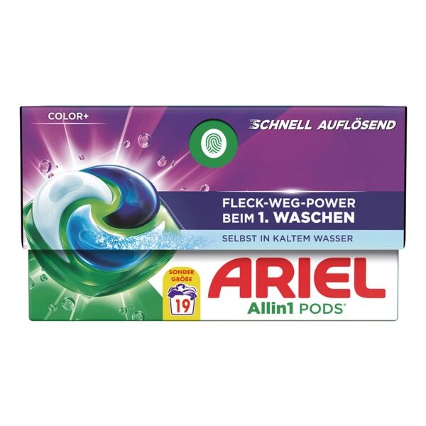 Kategorie: Waschmittel - Ariel - GTIN:8700216321556 - Hergestellt in Frankreich: Ariel Waschmittelkapseln werden in Frankreich hergestellt SCHNELLöSLICH: Ariel 4in1 PODS Waschmittelkapseln lösen sich selbst in kaltem Wasser schnell auf Makellos, bei kalten und kurzen Programmen: Ariel 4in1 PODS bieten einwandfreie Ergebnisse bei kalten und kurzen Programmen 100% wasserlösliche PODS-Folie: Ariel Waschmittel PODS haben einen vollständig wasserlöslichen PODS-Film Waschen Sie kälter mit Ariel PODS und helfen Sie, CO2 zu sparen: Kaltwäsche hilft, Strom und damit CO2 zu sparen. Es hilft auch Ihre Stoffe und Farben länger zu schützen (im Vergleich zu Waschprogrammen mit heißem Wasser) - 6,29 Euro bei Amazon Marketplace Health & Personal Care - gefunden von billiger.de Dieses Angebot ist eine gute Option für den Einstieg, da es eine kleinere PackungsgröÃ?e zu einem günstigen Preis bietet und speziell für Buntwäsche geeignet ist. ![]() ARIEL Waschkapseln »All-in-1 Pods Color+« 19 WL
