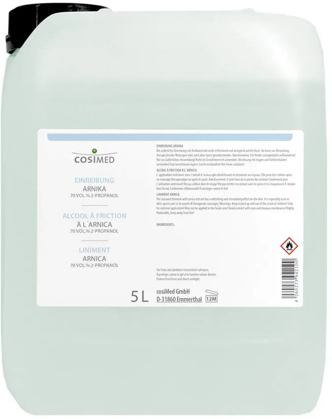 Verfügbarkeit: Auf Lager - Kategorie: Ganzkörperpflege - Bergila - GTIN:8033745021933 - Die Arnika-Latsche Einreibung mit biologischem Latschenkieferöl und Arnikaextrakt ist ein altbewährtes Hausmittel. Wirkt erfrischend und belebend und fördert das Wohlbefinden besonders nach sportlichen Aktivitäten. Mit reinem biologischem Latschenkiefernöl und Arnikaextrakt Erfrischt und belebt Ideal vor und nach sportlichen Aktivitäten Anwendung: Einmal oder mehrmals täglich auf die gewünschte Stelle einmassieren. Nur zur äußerlichen Anwendung. - 13,80 Euro bei Amazon Marketplace Health & Personal Care - gefunden von billiger.de Diese Arnika Einreibung mit 70 Volumenprozent ist eine sehr wirksame Option für intensive Anwendungen. ![]() ![]() CosiMed Einreibung Arnika, 70 Volume Prozent, 1er Pack (1 x 1 l)