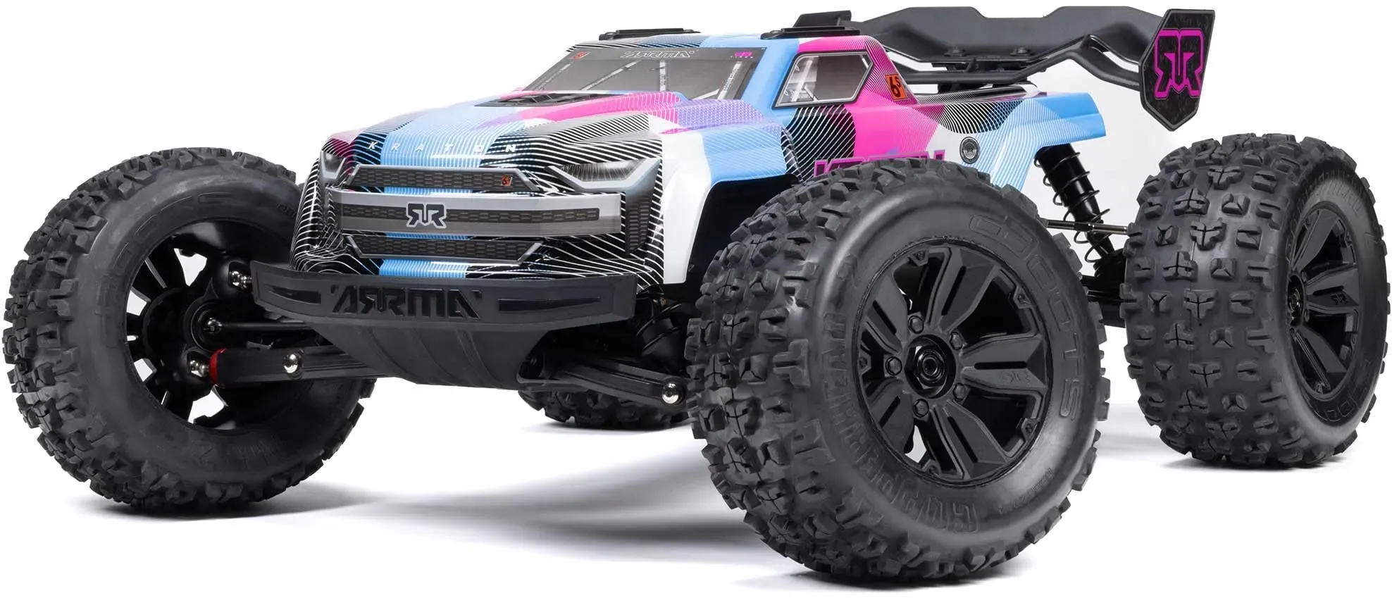 Verfügbarkeit: 7-9 Werktage - Kategorie: RC-Modellbau - Arrma - GTIN:0660132892944 - ARRMA KRATON 6S BLX 4X4 - 1/8 Maßstab Monster Truck Blau - Pink DerARRMA KRATON 6S BLX 4X4 im Maßstab 1/8 ist die ultimative Wahl für alle, die nach einem robusten und schnellen Monstertruck suchen. Mit einer Höchstgeschwindigkeit von über 105 km/h und einer außergewöhnlichen Haltbarkeit ist dieser Truck sowohl für erfahrene Fahrer als auch für Einsteiger perfekt geeignet. Ob du große Sprünge wagst oder durch unwegsames Gelände bretterst - der KRATON 6S BLX liefert unglaublichen Spaß und außergewöhnliche Leistung. Hauptmerkmale:€¢ Extreme Bash (EXB) Upgrades: Robustes 7075 T6 Aluminium-Chassis, verstärkte Differentiale, Edelstahlstoßstangen und eine stabile Flügelhalterung für maximalen Schutz bei intensiven Bashing-Sessions. €¢ Kräftige Geschwindigkeit: Mit dem leistungsstarkenSpektrum Firma 150A Smart V2 ESC und dem2050Kv Brushless-Motor erreichst du atemberaubende Geschwindigkeiten von bis zu 105 km/h. €¢ Flexibles Fahrverhalten: Wähle zwischen 4S- oder 6S-LiPo-Akkus - der KRATON 6S BLX bietet dir den perfekten Mix aus Kontrolle und Geschwindigkeit, egal ob du dich langsam an die Höchstleistung herantastest oder sofort durchstarten möchtest. €¢ Wasserdichte Elektronik: Alle wichtigen Komponenten sind wasserdicht, sodass du deinen Truck bei allen Wetterbedingungen und auch in schlammigen oder nassen Umgebungen nutzen kannst. €¢ Dynamische Dämpfung: ... Dieses RTR-Modell ist eine beliebte Wahl und bietet ein ausgewogenes Verhältnis von Preis und Leistung für den sofortigen Fahrspaß. ![]() Arrma Kraton 6S BLX (RTR Ready-to-Run)