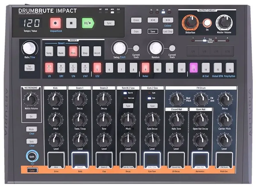 Arturia - EAN: 3760033531212 - Drum-Synth10 vollanaloge Drum-Instrumente: Kick; Snare 1; Snare 2 (Clap); Tom Hi; Tom Lo; Cymbal; Cowbell; Close Hat; Open Hat; FM Soundgroße Regelbereiche der Sound-Shaping-Regler ermöglichen eine große Palette individueller und einzigartiger KlängeColor Sound-Shaper für jedes Instrument verdoppelt die Anzahl möglicher Klangfarben und lässt sich einzeln pro Step hinzuschalten64 Pattern mit jeweils 64 StepsAkzent (Betonung) einzeln pro Step zuschaltbarStep-Repeat-Funktion für loopende Glitch-EffekteSong-Modus zum Aneinanderreihen von PatternPolyrhythmus-Funktion: Jedes Instrument kann eigene Patternlänge habenPattern-EffekteSwing- Zufallsgenerator (global oder pro Instrument)Pattern-Looper für DJ-PerformancesRoller für schnelle Rolls auf einzelnen Drum-InstrumentenGlobaler Distortion-Effekt auf dem Master-Ausgang erlaubt alles von subtiler harmonischer Anreicherung bis hin zur totalen Zerstörung des BeatsFlexible Sync-Optionen (Internal; USB; MIDI; Clock)unterstützt 4 verschieden - bei session.de - aus Yadore Produktdaten Die Noir Edition für 279 Euro von galaxus.de bietet eine stilvolle Alternative in Grau. ![]() Arturia DrumBrute Impact Noir Edition, Synthesizer, Grau