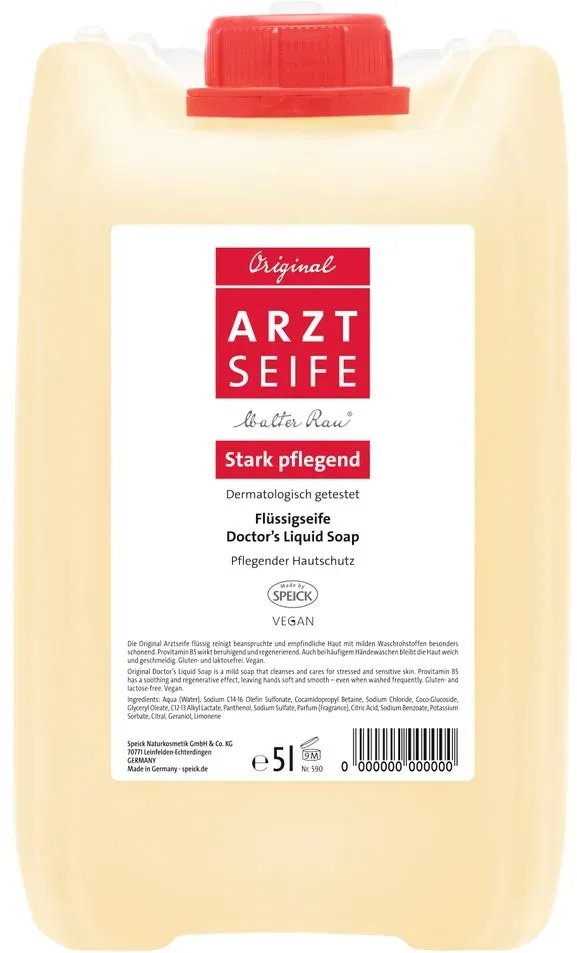 10 Händlerangebote bei billiger.de - Kategorie: Arzneimittel - SPEICK - Made by Speick Pflanzenöl-Arztseife flüssig Sanfte Waschpflege, speziell für die empfindliche und stark beanspruchte Haut entwickelt. Stark rückfettend Ohne Bakteriostatica Ohne Farbstoffe Ohne Silikone Gluten- und laktosefrei Dermatologisch allergologisch getestet Besonders für häufige Anwendung empfohlene, stark rückfettende Flüssigseife im praktischen Dispenser. Ohne Bakteriostatica. - GTIN:4009800005907 - PZN:04765923 Diese 5-Liter-Packung flüssiger Arztseife ist eine praktische und wirtschaftliche Wahl für den langfristigen Gebrauch oder größere Einrichtungen. ![]() ![]() ARZTSEIFE flüssig 5 l