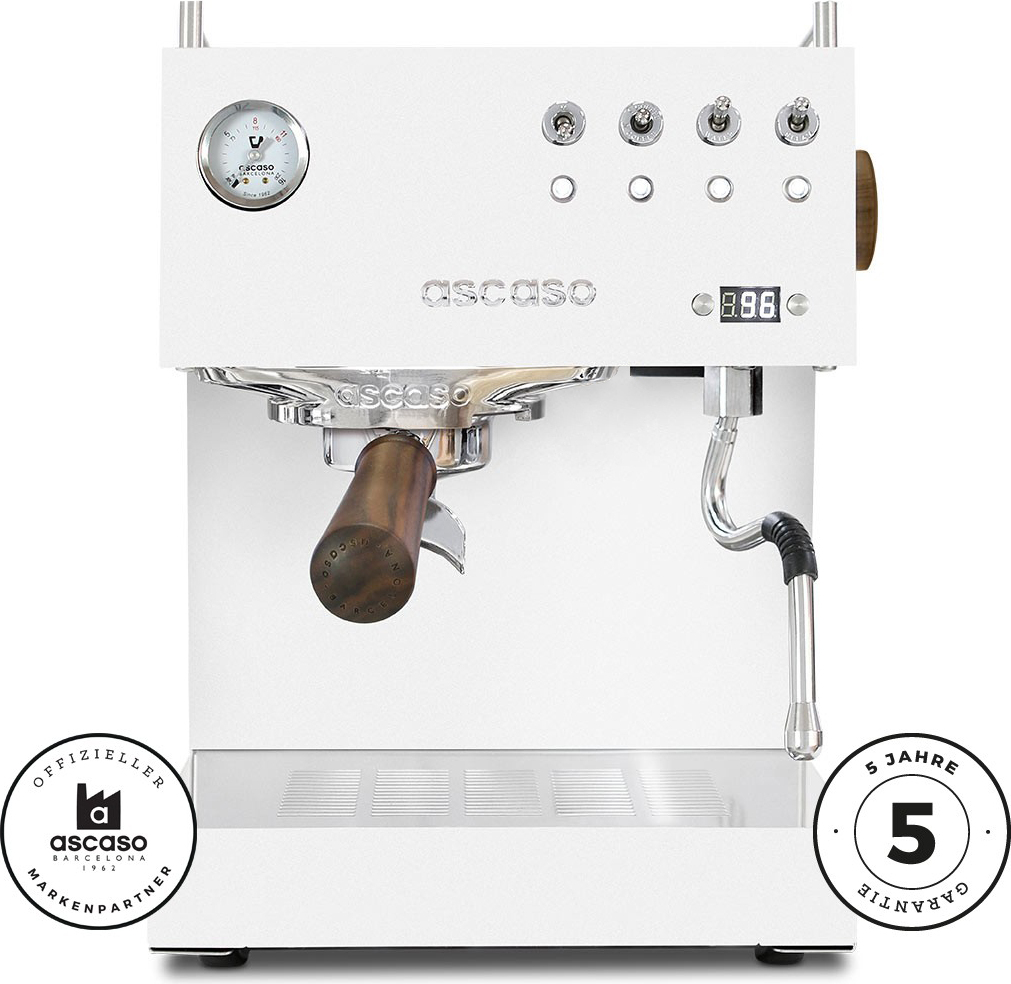 Ascaso - EAN: 8435172651293 - Ascaso Steel Uno PID, weißMit einem modernen Konzept und der PID Steuerung ist die Ascaso Steel Uno eine Einkreiser Espressomaschine mit einem Thermoblock aus Aluminium und Edelstahl, für eine schnelle Aufheizzeit, einen ordentlichen Brüh- und Dampfdruck sowie einen tollen Espresso. Mit der multifunktionalen PID Steuerung können sie die Temperaturvorwahl, eine zeitlich regulierbare elektronische Pre-Infusion und Shot-Clock (Timerfunktion) steuern. Die klassische Espresso- und Siebträgermaschine hat ein Präzisionsmanometer zum Ablesen des Brühdrucks an der Frontseite und Kippschalter zur einfachen Ein- und Ausschalten. Seitlich an der Siebträgermaschine befindet sich ein herausnehmbarer Wassertank mit der maximalen Füllmenge von 2 Liter.Minimalistisches Design und einfache Bedienung Espresso und Siebträgermaschine Ascaso Steel Uno mit PID SteuerungSiebträger- und Espressomaschine mit elektronischer PID SteuerungGradgenaue Temperaturvorwahl und Zeitanzeige während des BezugesEinstellbare Pre-Infusion und volumetrische PortionierungselektronikShot-Clock (Timerfunktion) und Standby-FunktionBrühdruckregulierung (Expansionsventil) und Manometer für den Brühdruck2 hochleistungs-Thermoblocks aus Aluminium und Edelstahlseparat steuerbare Dampfgruppeleistungsstarker, dauerhafter Dampf, drehbare und hitzebeständige Dampflanzeseitlich herausnehmbarer Wassertank (Füllmenge: 2 Liter)kompakte Bauweise, beleuchtete Elemente (Arbeitsfläche)mit Tassenablage und ... ![]() ![]() Ascaso Steel - UNO PID eBay weiß Siebträgermaschine - 5 Jahre Garantie