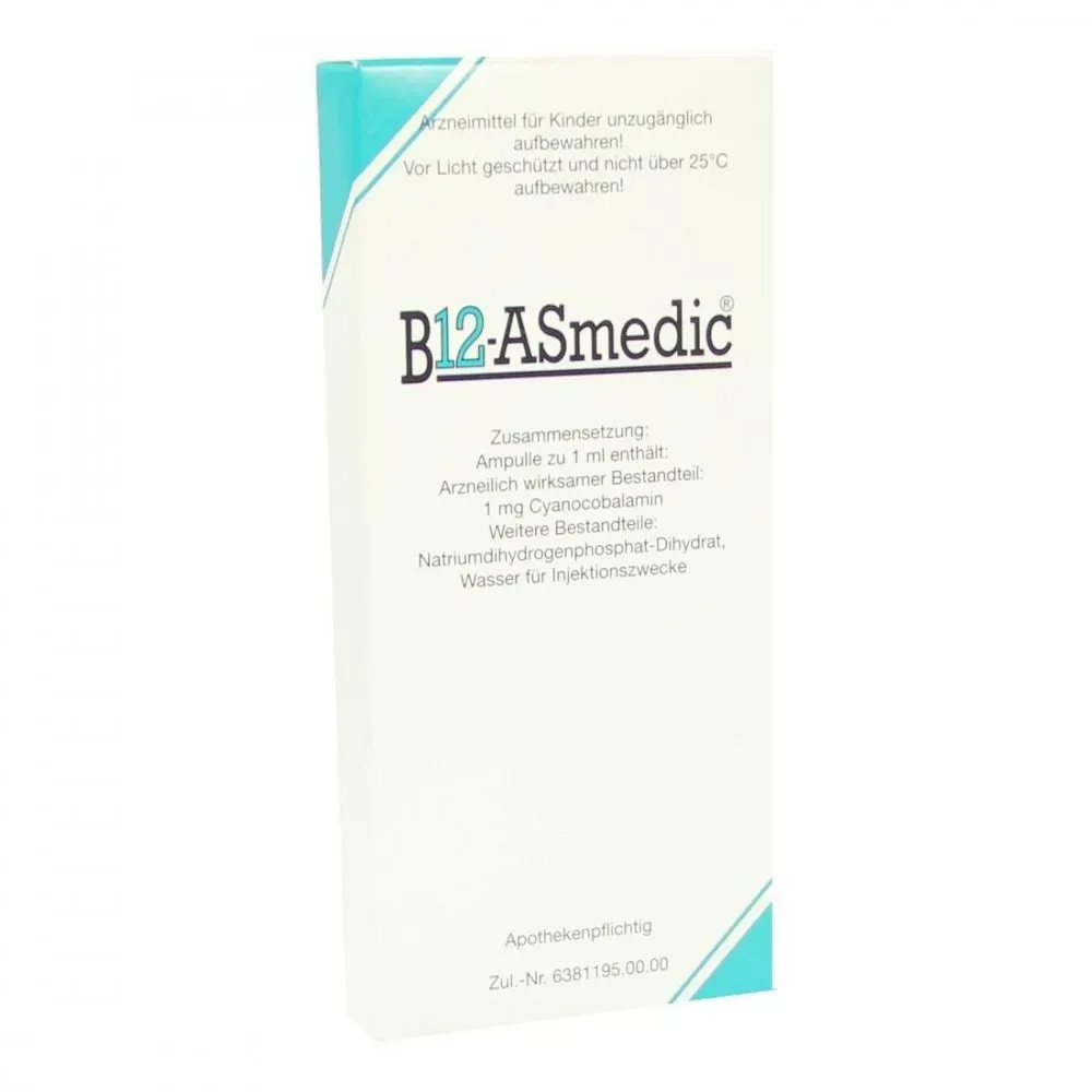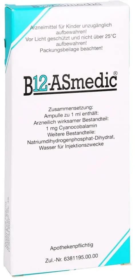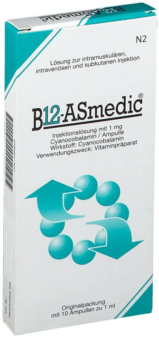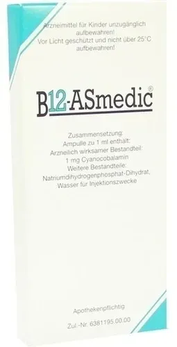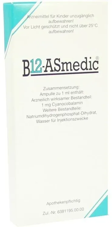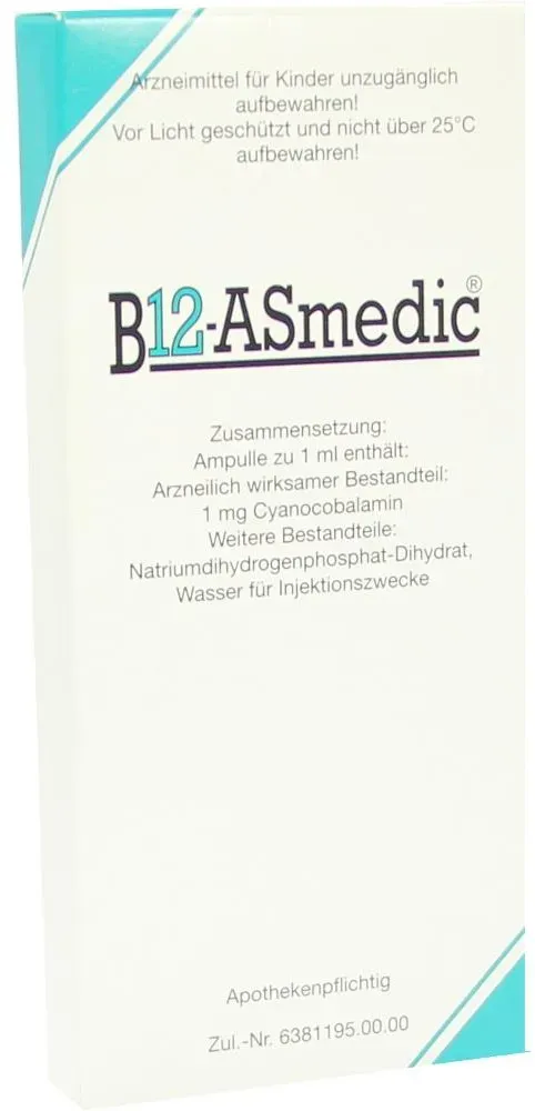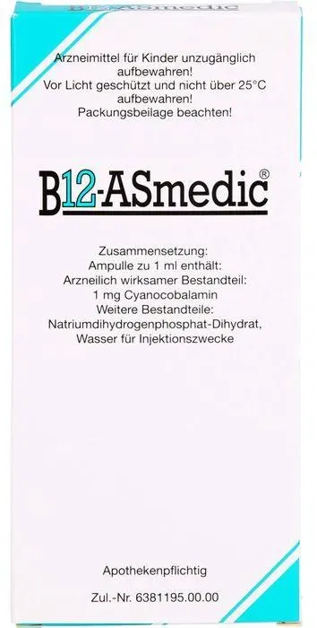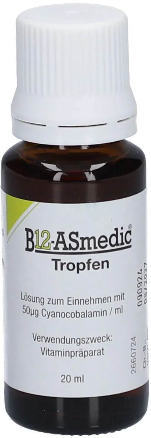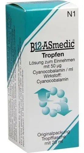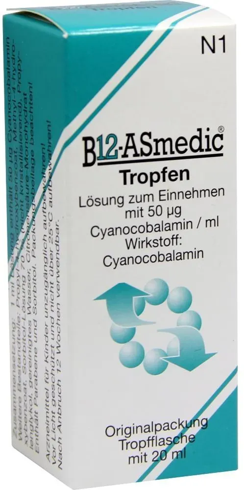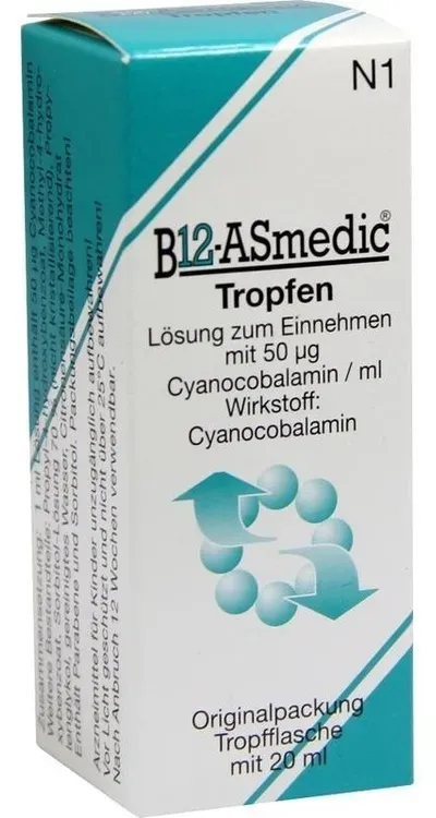 ? Was ist 'Asmedic B12'?B12-ASmedic® Tropfen sind ein reines Vitamin-B12-Präparat (Monopräparat) mit dem Wirkstoff Cyanocobalamin (50 µg pro Tropfen). Sie werden eingesetzt zur: