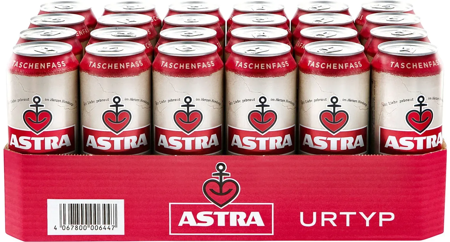 Zustand: Neu - 1,50 € / l - Pils Pilsner Bier - ASTRA Bavaria-St. Pauli GmbH - 64216 - EAN: 4067800006447 - Das Original aus dem Jahre 1909: mild, feinwürzig und einfach lecker. Mit viel Liebe gebraut im Herzen Hamburgs Ausgewogenes Pils mit einer feinen bittere und 4, 9 % Alkohol. Das Bier vom Hamburger Kiez mit Herz & Anker Lieferumfang: 24 x 500 ml Astra Urtyp Dosen-Bier / 6 € Pfand zuzüglich zum Kaufpreis Das passende Bier, egal ob zur Party, zum Public Viewing, Festival, am Strand oder im Stadtpark. Die Astra Dose ist der perfekte Begleiter für jeden Anlass. - bei Amazon.de Das 24er-Dosen-Set Astra Rakete ist eine bequeme Option für Liebhaber dieses Biermischgetränks. ![]() ![]()