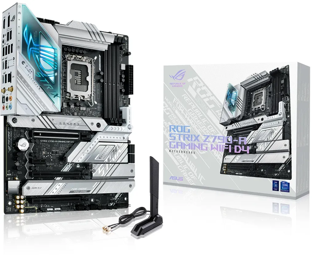 lieferbar-in 4-5 Werktagen bei dirAsus ROG Strix Z790-A Gaming WIFI D4 Mainboard, Intel Z790, LGA 1700, ATX, DDR4, M.2, PCIe 5.0, WiFi 6E silberfarben