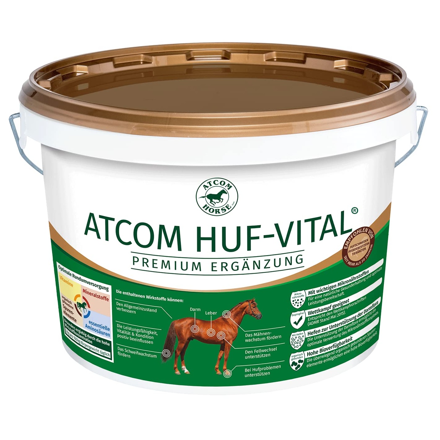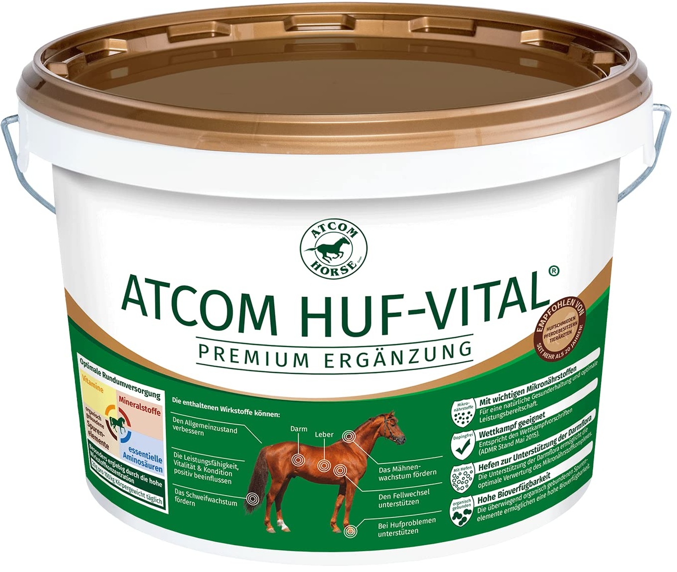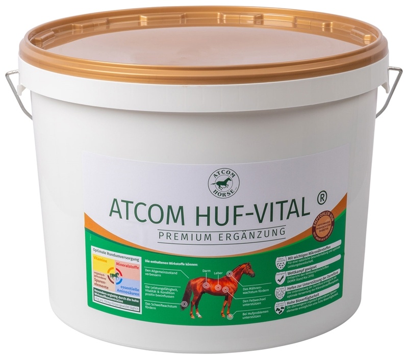 Kategorie: Pferdefutter - Atcom - GTIN:4260259290287 - Atcom - Atcom Huf-Vital enthält alle notwendigen Vitamine, Mineralstoffe, Spurenelemente und Aminosäuren für schöne Hufe, gepflegtes Fell und Haar, eine gesunde Darmflora und starke Muskeln. Organisch gebundene Spurenelemente sind besonders gut verfügbar und stärken Dein Pferd gemeinsam mit wertvollen Hefen und Kräutern von Innen heraus. - 109,90 Euro bei Amazon Marketplace Lawn & Garden - gefunden von billiger.de ![]() ![]() Atcom Huf-Vital - 10kg Pferde eBay Mineralfutter Hufwachstum Gesunde Hufe Hufvital