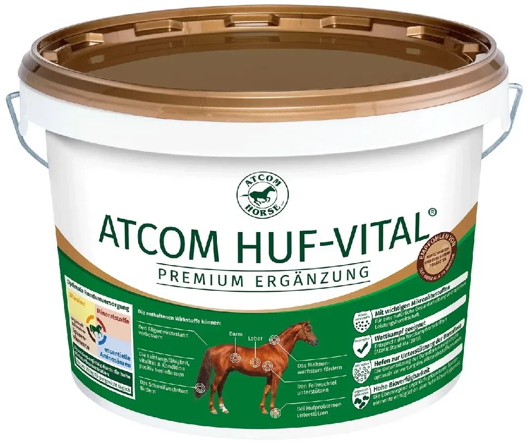 Atcom huf vital META PreisvergleichMit dem Meta-Preisvergleich suchen Sie gleichzeitig bei den großen Preisvergleich Portalen!Jetzt live Suche nach atcom huf vital starten! Atcom huf vital KaufberatungBeim Produkt ATCOM HUF-VITAL handelt es sich um ein hochwertiges Ergänzungsfuttermittel zur ernährungsbedingten Optimierung des Hufwachstums und der Hufhornqualität bei Pferden. Es ist speziell entwickelt für Pferde mit Hufproblemen wie brüchigen, weichen oder langsam wachsenden Hufen, Rissen, Problemen am Strahl oder der weißen Linie sowie hohlen oder losen Wänden[1][2]. Wichtige Produktmerkmale sind: