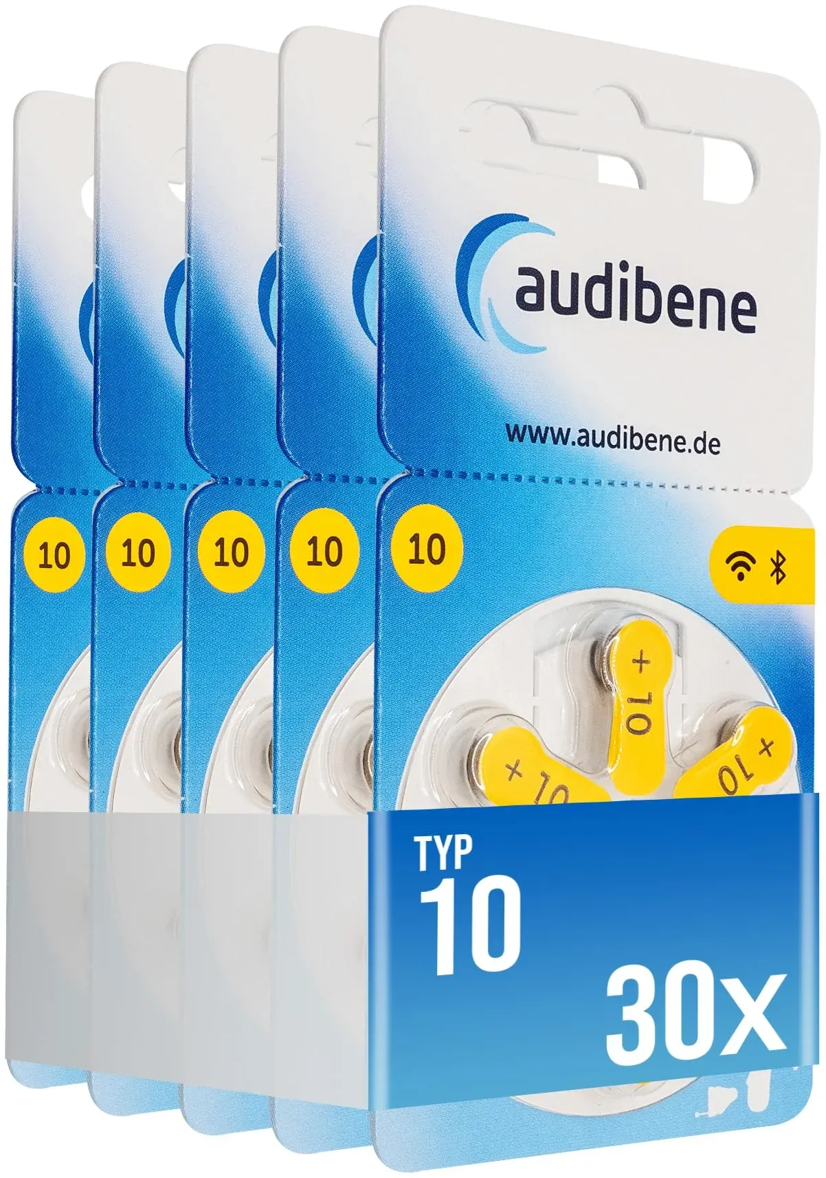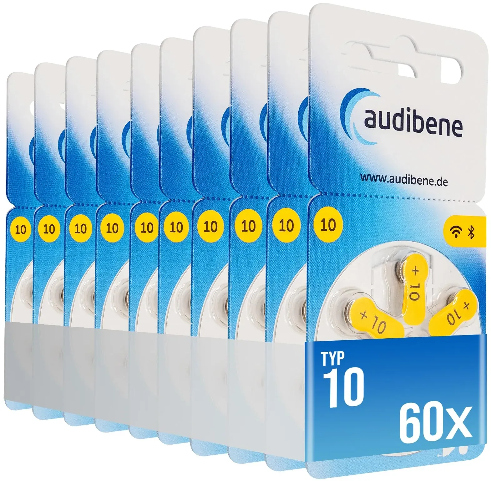 Auf Lager Versand durch Amazonaudibene Hörgerätebatterien Typ 10 gelb, Batterien für Hörgeräte 60 Stück Vorratspack, Made in Germany, inkl. GRATIS Reinigungstuch, Wireless Approved, quecksilberfrei