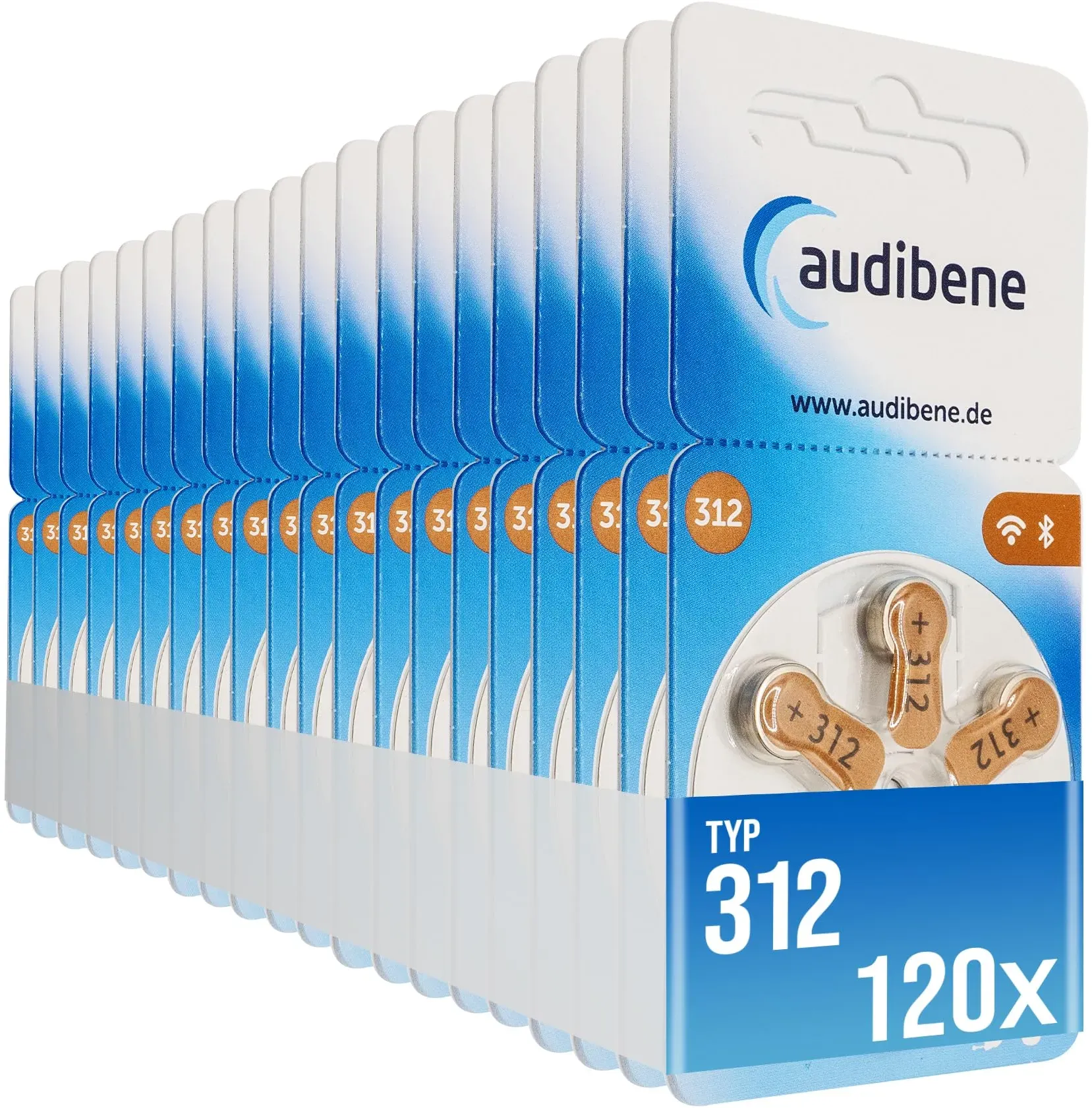 Auf Lager Versand durch Amazonaudibene Hörgerätebatterien Typ 312 braun, Batterien für Hörgeräte 120 Stück Vorratspack, Made in Germany, inkl. GRATIS Reinigungstuch, Wireless Approved, quecksilberfrei