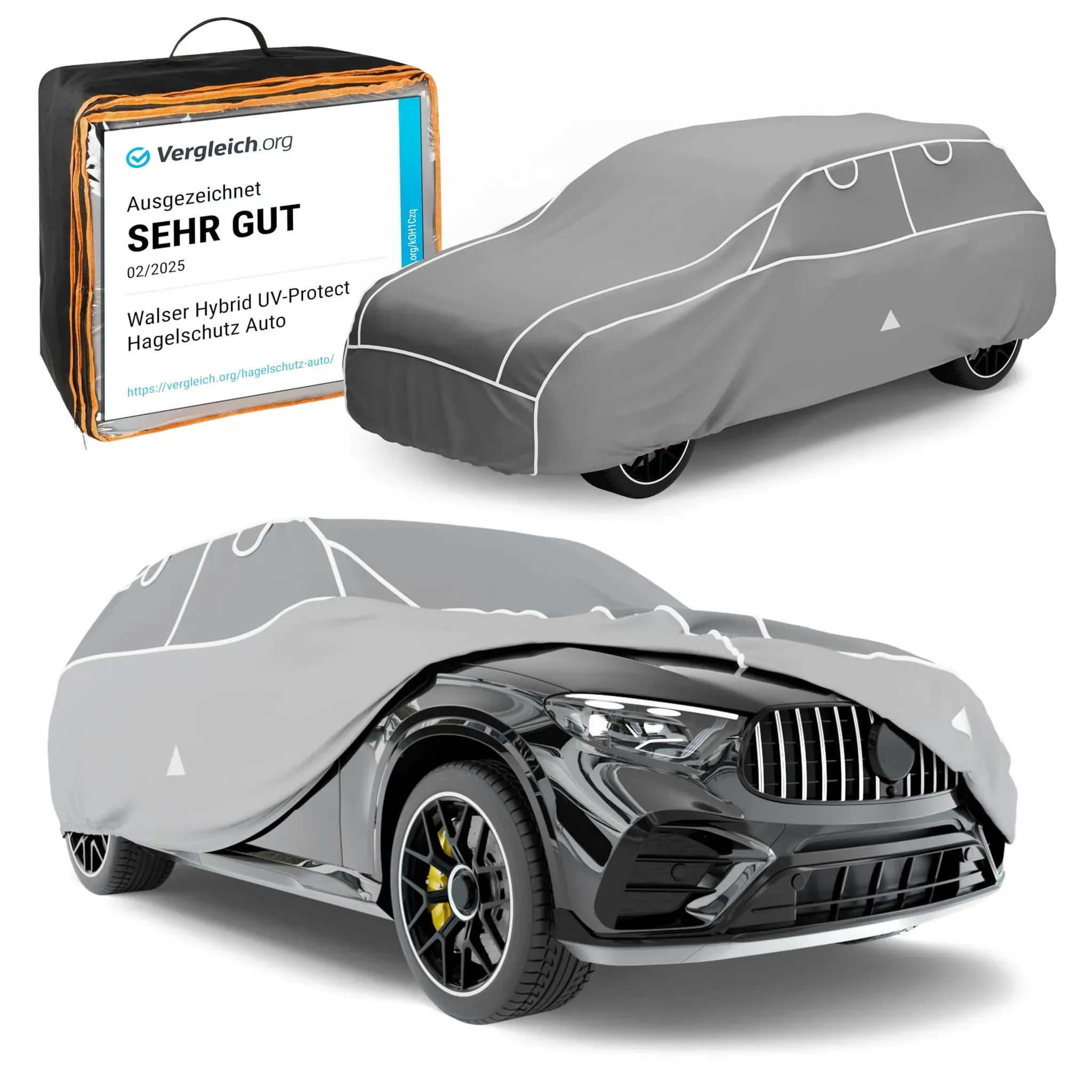 Kategorie: Sonstiges Autozubehör - Walser - GTIN:9001778310811 - Zuverlässiger Hagelschutz - Die wasserabweisende WALSER Auto Abdeckung Premium Hybrid bietet optimalen Schutz bei normalen Hagelschauern (Durchmesser ca. 22,7 mm, 6.100 mm3, Aufprallgeschwindigkeit bis zu 70 km/h). Dank 7 mm dicker Hybrid Schaumstoffschicht absorbiert die Autogarage Abdeckung die Wucht des Hagelaufpralls bestmöglich. Auch bei extremem Hagel verhindert die Plane ein Durchschlagen der Windschutzscheibe, schützt vor extremen Beulen und sorgt für ein gutes Gefühl Hochwertiges Material - Die robuste und langlebige Abdeckplane Auto wurde unter kontrollierten Bedingungen geprüft und besteht aus vier Materialschichten. Zusätzlich zur 4 mm weichen Hagel-Absorptions-Schicht, einer 3 mm harter Durchschlagschutz-Schicht, einer wasserabweisenden Schicht außen, schützt auch eine lackschonende Fleece Innenschicht der Hagelschutzplane Auto vor Kratzern und Beulen am Fahrzeug Perfekte Passform - Die atmungsaktiven und hochwertigen Premium PKW Abdeckplanen aus 100% Polyester sind für viele gängigen Fahrzeuge als Hagelschutz Auto Garage geeignet (siehe Infobilder zu Abmessungen der Autoplane). Elastische Nähte der wetterfesten Abdeckplane Auto Garage und 3 im Lieferumfang inkludierte Spanngurte sorgen dabei für bombenfesten Halt der Hagelmatte Auto Praktische Features - Die Vollgarage punktet mit Reflektoren vorne, hinten und seitlich für erhöhte Sichtbarkeit. Ventilationsöffnungen sorgen für eine optimale ... Die WALSER Premium Hagelschutz Abdeckplane Auto in Größe 8 für SUV/Van ist TÜV-geprüft und bietet exzellenten Schutz vor Hagel und UV-Strahlung. ![]() ![]() WALSER Premium Hagelschutz Abdeckplane Auto, Auszeichnung Sehr Gut* Auto Hagelschutzplane, TüV geprüfte* Autogarage Abdeckung, Abdeckplane Auto Hybrid UV Protect, Abdeckung Auto Größe 8 SUV/Van