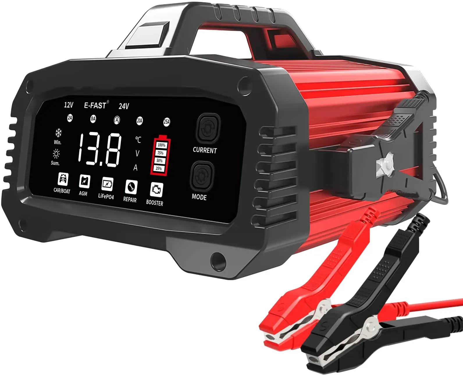 Auf Lager Versand durch AmazonYIFASITE 25A Autobatterie Ladegerät, 12V/24V Lifepo4 Smart Vollautomatische Ladegeräte für Autobatterien KFZ Batterieladegerät mit LCD-Bildschirm für Auto LKW Motorrad Rasenmäher Boot