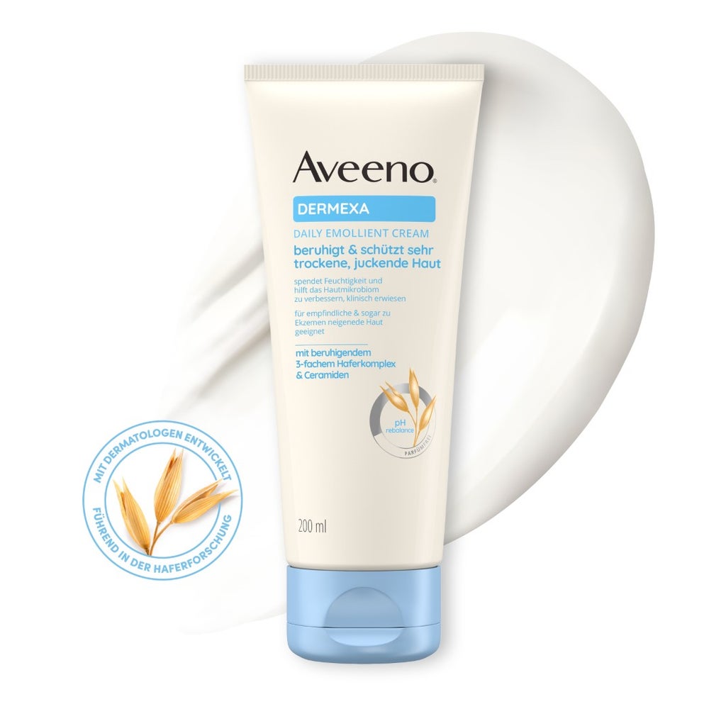 Aveeno - EAN: 3574661808895 - Aveeno Dermexa Feuchtigkeitsspendende Tägliche Emollientien Creme Körperlotion mit beruhigendem 3-fachem Haferkomplex für sehr trockene, juckende, empfindliche, zu Ekzemen (Neurodermitis) neigende Haut Aveeno Dermexa Feuchtigkeitsspendende Tägliche Emollientien Creme - beruhigt schützt sehr trockene, juckende Haut. Die Körperlotion spendet Feuchtigkeit und hilft, das Hautmikrobiom zu verbessern, klinisch erwiesen. Die Hautpflege Creme ist für empfindliche und sogar zur Ekzemen neigende Haut (Neurodermitis) geeignet. Sie hilft wissenschaftlich erwiesen, Schübe starker Hauttrockenheit zuverhindern. Die parfümfreie Feuchtigkeitscreme mit 3-fachem Haferkomplex Ceramiden eignet sich für Babys, Kinder und Erwachsene mit sehr trockener, juckender, zu Ekzemen (Neurodermitis) neigender Haut. Pflege für die Haut - Die Dermexa Emollientien Creme von Aveeno beruhigt schützt sehr trockene, juckende Haut, spendet Feuchtigkeit und hilft das Hautmikrobiom zu verbessern, klinisch erwiesen. Die Körpercreme sellt den natürlichen pH-Wert der Haut wieder her Spendet intensiv Feuchtigkeit - Die Hautcreme mit dem 3-fachem Haferkomplex mit nährendem Haferextrakt, Hafermehl und Haferöl sowie Ceramiden beruhigen sehr trockene, empfindliche Haut. Die Haut wird mit intensiver Feuchtigkeit versorgt und Feuchtigkeitsverlust wird verhindert - für eine widerstandfähigere Haut ab dem 1. Tag. Sehr trockene, juckende Haut wird geschützt, für sofortigen Komfort. Hilft ... ![]() Aveeno Dermexa Emollientien Creme 200 ml