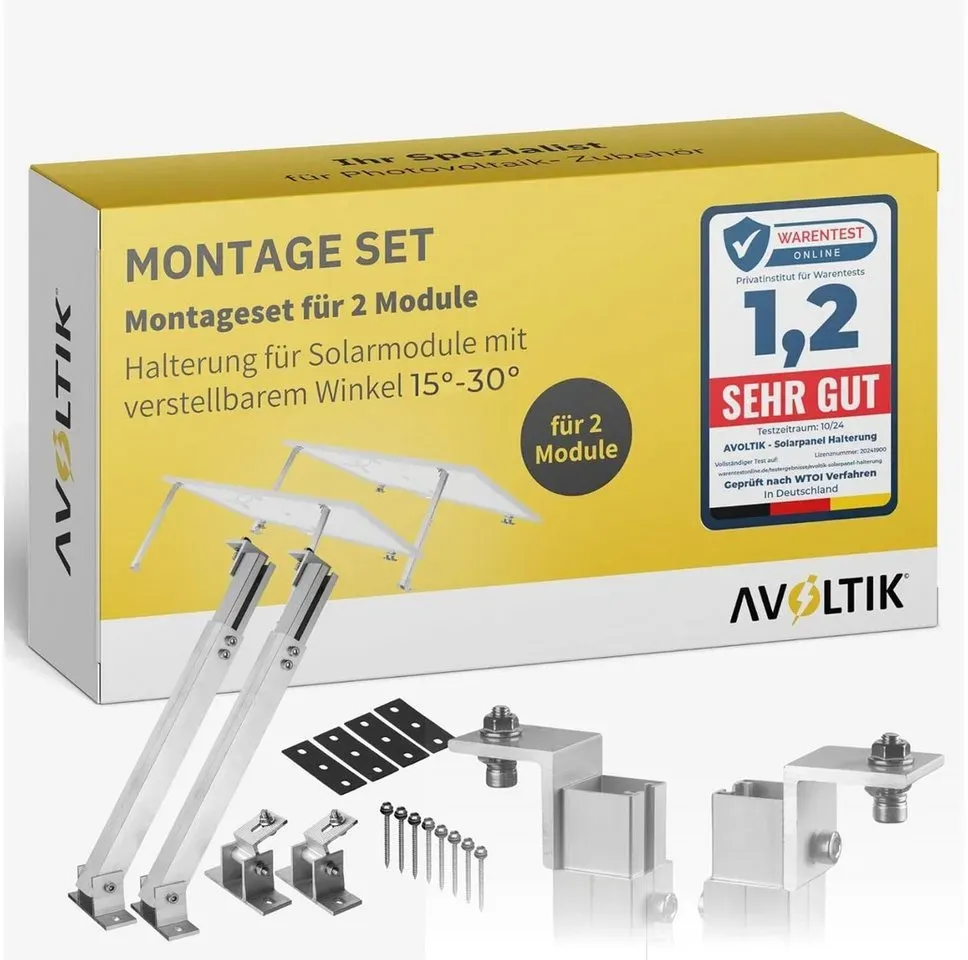 89.90 /1Stk - Kategorie: Solarpanel-Halterung - avoltik - GTIN:4063811153477 - Stromversorgung Art Stromversorgung , nicht zutreffend, Produktdetails Geeignet für , Solaranlagen, Lieferumfang , Hochwertige Balkonhalterung für ein Solarpanel, Ausstattung , Hochwertige Balkonhalterung für ein Solarpanel, Maße & Gewicht Gewicht , 2100 g, Farbe & Material Material , BalkonHalterung, Hinweise Sprachen Bedienungs-/Aufbauanleitung , Deutsch (DE), Technische Daten Modellbezeichnung , Avoltik Balkonhalterung, WEEE-Reg.-Nr. DE , 65283308, - 89,90 Euro bei OTTO - gefunden von billiger.de Dieses Montageset für Ziegeldächer aus Edelstahl ist eine langlebige und sichere Lösung für die Befestigung von zwei PV-Modulen. ![]() ![]() Avoltik Solar Halterung Ziegeldach I Set für 2 PV Module 30-45mm I Solarmodul Halterung Balkonkraftwerk I Solarmodulbefestigungsset für Ziegeldächer aus Edelstahl 1.4301 I PV-Halterung Montageset