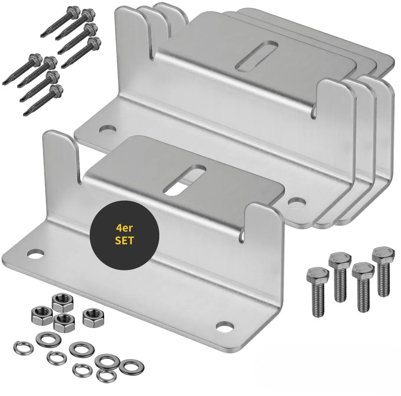 Kategorie: Solarpanel-Halterung - avoltik - GTIN:4063811157390 - Solarmodul Endklemme & Mittelklemme Set: Das Set enthält 4 Endklemmen und 4 Mittelklemmen, ideal für die Befestigung von Solarmodulen mit Rahmenhöhen zwischen 30mm und 45mm. Perfekt für PV-Anlagen, um eine sichere und stabile Befestigung zu gewährleisten. Hochwertige Aluminiumlegierung: Unsere Solarmodul Klemmen bestehen aus strapazierfähigem AL6005-T5 Aluminium, das korrosions- und UV-beständig ist. Diese Solarpanel Befestigung eignet sich hervorragend für den Einsatz bei extremen Wetterbedingungen. Einfache Montage dank EASY-CLICK System: Die Solarmodul Halterung Klemmen wird mit allen benötigten Schrauben und Muttern geliefert. Dank des praktischen Designs der Mittelklemmen und Endklemmen können die Module einfach und sicher geklickt werden. Spart Installationszeit und sorgt für maximalen Halt und Komfort. Stabilität und Sicherheit: Die Solarmodul Klemmen sind speziell für PV-Module entworfen, um eine sichere und langlebige Verbindung zu gewährleisten. Die präzise polierte Oberfläche und das Nut-Design sorgen für eine feste und stabile Befestigung am Solarpanel. Universelle Kompatibilität: Diese Solarmodul Halterung passt auf die meisten gängigen Montageschienen. Bitte prüfen Sie vor dem Kauf die Kompatibilität mit Ihrer PV-Befestigungsschiene. Siehe technische Details. - 19,90 Euro bei Amazon Marketplace Home Improvement - gefunden von billiger.de Dieses Flachdach-Halterungsset für zwei Panele bietet eine einfache und effektive Lösung für die Montage auf Flachdächern. ![]() ![]() Avoltik Solarpanel Halterung Flachdach I Set für 2 Panele I Solarmodul Halterung Balkonkraftwerk I Flachdach Halterung für PV Module I Solarmodulbefestigungsset mit verstellbarer Endklemme von 30-35mm