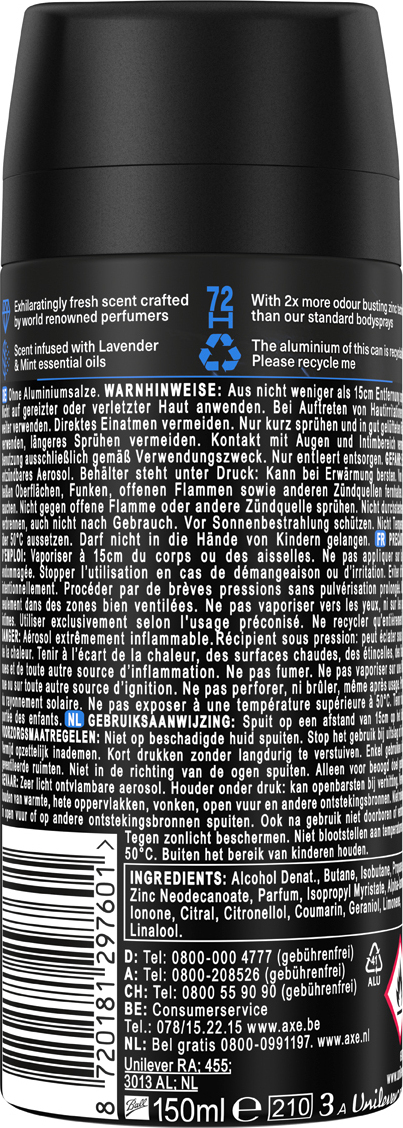 Zustand: Neu - 50,60 € / l - Deo - Axe Unilever Germany - 69611657 - EAN: 8720181297793 - Mit AXE Premium Bodyspray Blue Lavender aus der AXE Fine Fragrance Collection flexen wie mit Parfum Mit effektivem AXE-Schutz ohne Aluminiumsalze schützt das Deodorant Spray bis zu 72 Stunden gegen Körpergeruch und verleiht einen spektakulären Duft Das AXE Premium Bodyspray enthält einen doppelt so hohen Anteil der patentierten, geruchsbindenden Zink-Formel Ein unbeschreiblicher Bodyspray-Duft mit geeistem Lavendel, Minze und Bernstein, Noten von Zedernholz, Vanillecreme und sinnlicher Tonkabohne Das Deo ohne Aluminium von AXE verleiht Männern einen hochwertigen und verführerischen Duft Das Aluminium der Body Spray Dose ist unbegrenzt recycelbar. Bitte nach der Verwendung ins Recycling geben - 5 Händler im amazon.de Marketplace ![]() ![]() Axe Premium - Bodyspray Blue eBay Lavender Deo ohne Aluminiumsalze 150ml