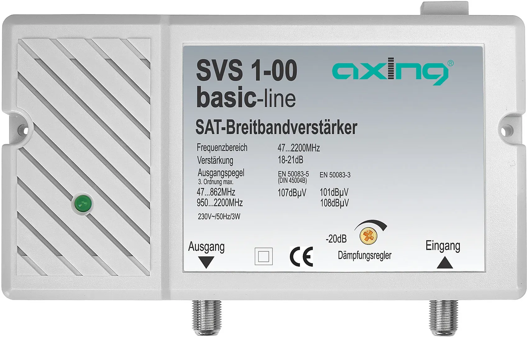 52,84 /Stück - Kategorie: Signalverstärker - Axing - GTIN:7611682150018 - Praktischer HDTV-tauglicher Basic-line Satelliten-Breitbandverstärker für einen Frequenzbereich von 47 bis 862 und 950 bis 2200 MHz. Das Bauteil ist einsetzbar als Streckenverstärker nach der Zusammenführung von terrestrischen, BK- und SAT-Signalen. - 52,84 Euro bei elepi.de - gefunden von billiger.de ![]() ![]() Axing SVS - 1-00 SAT-Breitbandverstärker