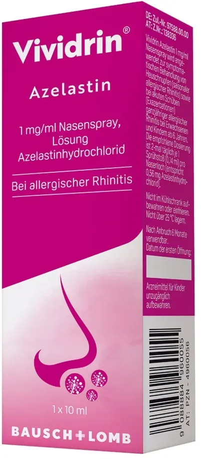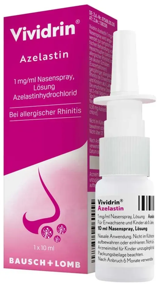678,00 /l - Kategorie: Arzneimittel - Bausch + Lomb - GTIN:4150129105523 - PZN:12910552 - Vividrin Azelastin Nasenspray Akuthilfe 10 ml - rezeptfrei - von Dr. Gerhard Mann - Chemisch-pharmazeutische Fabrik GmbH - Nasenspray - 10 ml - 6,78 Euro bei DocMorris Apotheke - gefunden von billiger.de Dieses Angebot ist mit 7,47 Euro eine preiswerte Option für ein 10ml Nasenspray und wird von mehreren Händlern auf Amazon angeboten. ![]() ![]() Vividrin Azelastin Nasenspray Allergie - Schnell wirksam gegen Pollenallergie - Effektiver Schutz bei Heuschnupfen - Antiallergisches Nasenspray für Erwachsene & Kinder ab 6 Jahren (1 x 10 ml)