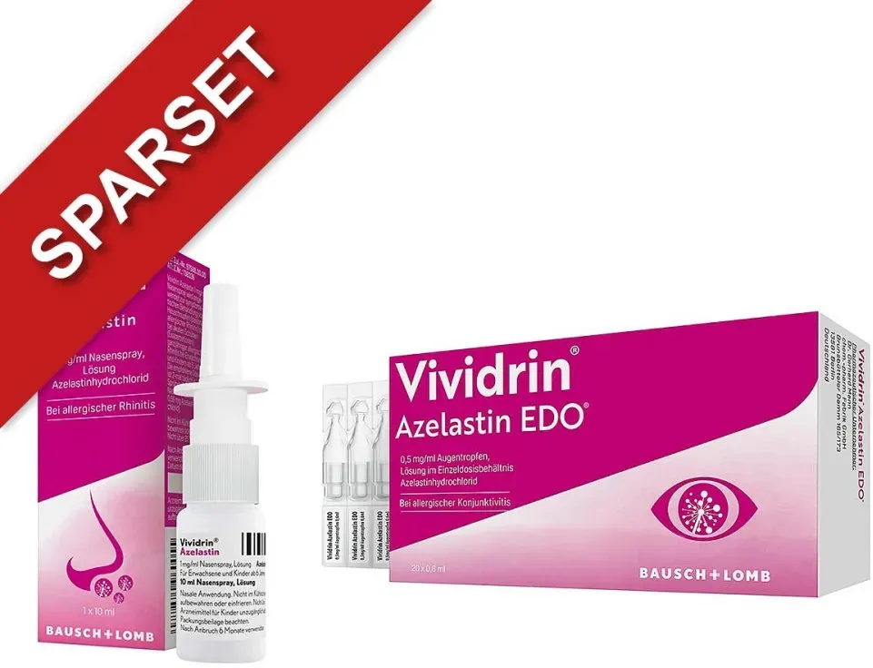 Kategorie: Tiergesundheit - Bausch + Lomb - Anwendungsgebiet von Vividrin Azelastin Nasenspray 1 mg/ml + Augentropfen 0.5 mg/ml Vividrin Azelastin Nasenspray wird angewendet zur symptomatischen Behandlung von Heuschnupfen (saisonaler allergischer Rhinitis) und bei akuten Schüben ganzjähriger allergischer Rhinitis. Es ist für Erwachsene und Kinder ab n geeignet. Vividrin Azelastin Augentropfen Blütenpollen, Hausstaubmilben, Tierhaare oder andere körperfremde Substanzen können allergische Reaktionen wie brennende, tränende oder juckende Augen verursachen. Vividrin Azelastin Augentropfen wirken minutenschnell und zuverlässig gegen akute Beschwerden am Auge. Das gut verträgliche Arzneimittel mit dem bewährten Wirkstoff Azelastin hilft sowohl bei saisonalen allergischen Symptomen am Auge wie z. B. Heuschnupfen als auch bei nicht saisonaler allergischer Bindehautentzündung (Konjunktivitis).Wirkungsweise von Vividrin Azelastin Nasenspray 1 mg/ml + Augentropfen 0.5 mg/ml Vividrin Azelastin Nasenspray Bei Kontakt mit Allergenen schütten körpereigene Abwehrzellen vermehrt den Entzündungsbotenstoff Histamin aus und lösen so eine Immunreaktion aus. Der gut verträgliche Wirkstoff Azelastin wirkt dreifach gegen die lästigen Symptome. Er hemmt die Histamin-Rezeptoren und reduziert dadurch die typischen Beschwerden, wie z.B. Niesreiz oder eine kribbelnde Nase. Zusätzlich werden die Abwehrzellen stabilisiert und so die Freisetzung von Histamin gemindert, zudem wirkt Azelastin ... Für 17,69 Euro erhalten Sie ein Set aus Nasenspray und Augentropfen, das eine umfassende Linderung bei Allergiesymptomen bietet. ![]() ![]() Bausch + Lomb Vividrin Azelastin Nasenspray + AT Set 1 Set
