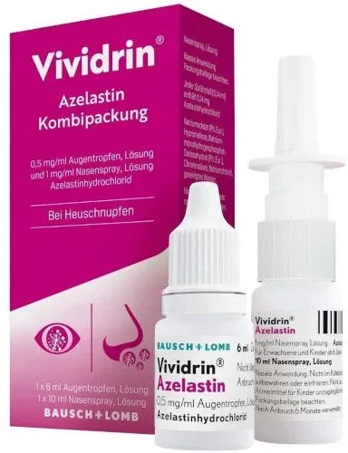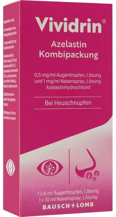 1293,33 /l - Kategorie: Arzneimittel - Bausch + Lomb - GTIN:4150129105462 - PZN:12910546 - Wirkstoff: Azelastinhydrochlorid Anwendungsgebiete: Zur Behandlung und Vorbeugung von Symptomen saisonal auftretender allergischer Beschwerden am Auge (saisonale allergische Konjunktivitis bei Heuschnupfen) bei Erwachsenen und Kindern ab n. Zur Behandlung von Symptomen nicht-saisonal auftretender (perennial) allergischer Beschwerden am Auge (perenniale allergische Konjunktivitis) bei Erwachsenen und Jugendlichen ab 1 n. Warnhinweise: Arzneimittel für Kinder unzugänglich aufbewahren. Enthält Benzalkoniumchlorid. Packungsbeilage beachten. - 7,76 Euro bei medikamente-per-klick.de - gefunden von billiger.de Dieses Angebot ist mit 9.90 Euro eine preiswerte Kombipackung aus Augentropfen und Nasenspray. ![]() ![]() Bausch + Lomb Vividrin Azelastin Kombipackung bei Heuschnupfen & Allergien