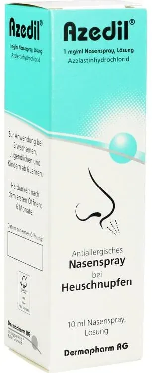 EAN: 4150022188555 - Allergodil akut Nasenspray Azelastin Spray gegen Heuschnupfen & nicht-saisonale allergische Rhinitis Antiallergisches Nasenspray: Das Spray wird zur Linderung der Allergiesymptome bei Heuschnupfen (saisonale allergische Rhinitis) angewendet und eignet sich für Erwachsene und Kinder ab n Gezielte Behandlung der Nase: Das Antiallergikum wird bei Heuschnupfen angewendet und hemmt u.a. übermäßigen flüssigen Schnupfen, Niesreiz und Schwellungen der Nasenschleimhaut Abschwellendes Antiallergikum: Das Spray enthält Azelastinhydrochlorid, einen antiallergischen Wirkstoff, der auch entzündungshemmend wirkt - bereits nach 15 Minuten werden die Symptome gelindert Einfache Verwendung: Die Anwendung sollte bei aufrechter Kopfhaltung durchgeführt werden. Zweimal täglich (morgens und abends) jeweils einen Sprühstoß in jedes Nasenloch einsprühen Allergischen Schnupfen lindern mit Allergodil akut Nasenspray Eine Allergie ist eine überreaktion des körpereigenen Abwehrsystems auf harmlose Stoffe wie zum Beispiel bestimmte Pollen oder Gräser. Auch wenn es sich um harmlose Auslöser handelt, sind Symptome einer Pollenallergie oft sehr unangenehm und die Betroffenen werden in ihrem Alltag eingeschränkt. Das Allergodil akut Nasenspray mit dem Wirkstoff Azelastinhydrochlorid kann bei diesen Allergiebeschwerden schnelle und langanhaltende Linderung verschaffen. Der Wirkstoff hemmt das bei einer Allergie vermehrt ausgeschütteten Histamin und andere entzündlich wirkende Stoffe, ... Dieses Angebot ist mit 5.53 Euro eine preiswerte Option für Azedil Nasenspray. ![]() ![]() axicur Azedil 1 mg/ml Nasenspray Lösung