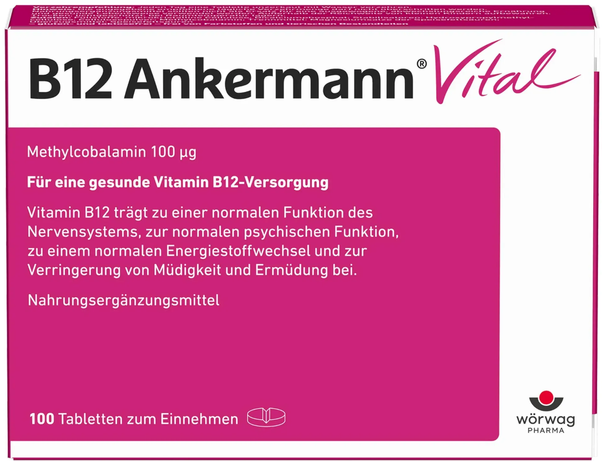 Zustand: Neu - 814,10 € / kg - Vitamin B12 Vitamin B12 Präparate - B12 Ankermann WÖRWAG Pharma GmbH & Co. KG - 11193781 - EAN: 4150111937811 - VITAMIN B12 trägt bei zur Verringerung von Müdigkeit und Ermüdung VEGAN: B12 Ankermann Vital ist frei von Farbstoffen, tierischen Bestandteilen und laktosefrei NAHRUNG ERGÄNZEN: B12 Ankermann Vital versorgt den Körper mit Energie * NUR 1x TÄGLICH Vitamin B12 Tablette einnehmen und Geist und Nerven fit halten * Nahrungsergänzungsmittel aus der Apotheke (PZN-11193781). (*Vitamin B12 trägt zu einem normalen Energiestoffwechsel, zur Verringerung von Müdigkeit und Ermüdung, zur normalen psychischen Funktion und zu einer normalen Funktion des Nervensystems bei.) - Verkäufer: esando im amazon.de Marketplace ![]() ![]() B12 Ankermann® Vital: Deine B12-Quelle. Ideal für Veganer, 100 Stück