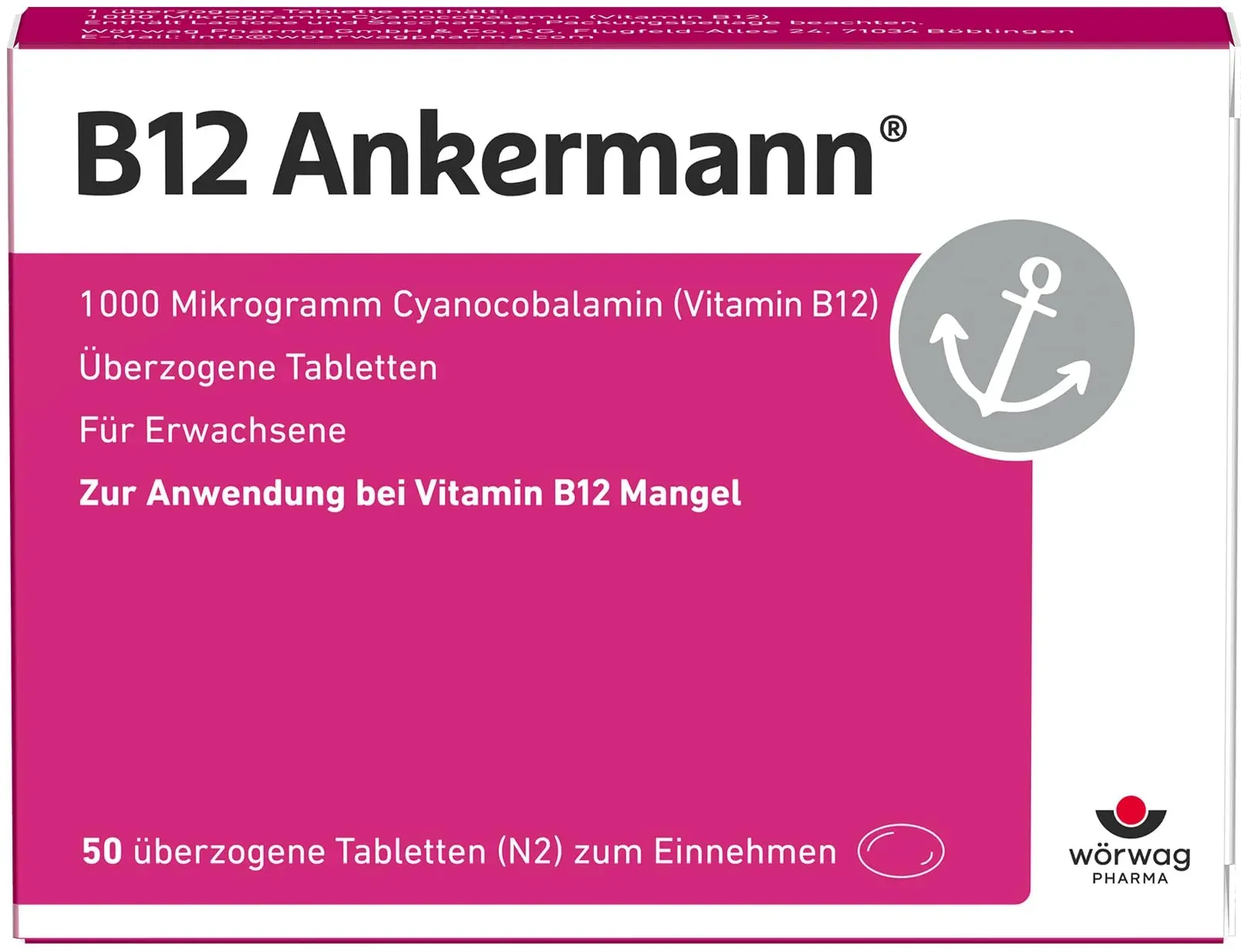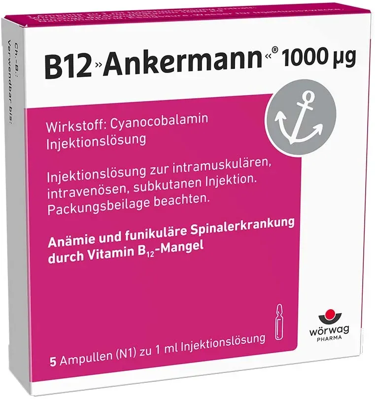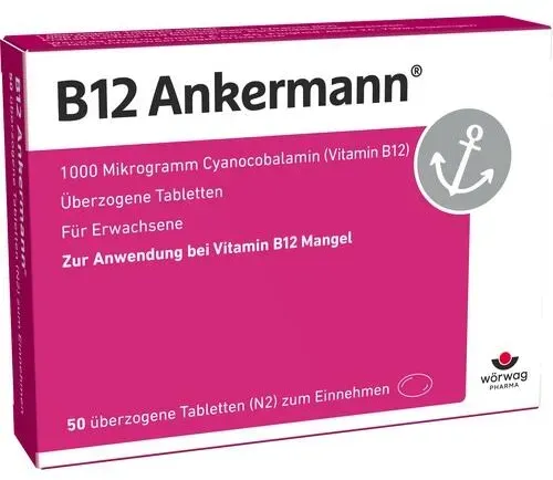 0.48 / 1 Stück - Kategorie: Arzneimittel - Wörwag Pharma - GTIN:4150035410506 - PZN:03541050 - Wirkstoff: Cyanocobalamin 1000 ?g. Anwendungsgebiete: Behandlung von Vitamin-B12-Mangelzuständen, die durch Mangelernährung verursacht werden, Behandlung (Erhaltungstherapie) von Vitamin-B12-Mangelzuständen, z. B. in Folge einer beeinträchtigten Aufnahme (Resorption) von Vitamin B12, dauerhafte Behandlung einer durch Vitamin-B12-Mangel induzierten perniziösen Anämie nach Normalisierung der Blutwerte.Die Behandlung einer perniziösen Anämie bzw. neurologischer Symptome erfolgt zu Beginn parenteral bis zur Normalisierung der Blutwerte. B12 Ankermann wird angewendet bei Erwachsenen. Wörwag Pharma GmbH & Co. KG, 71034 Böblingen Was enthält B12 Ankermann und wie wirkt es? B12 Ankermann enthält 1.000 Mikrogramm Vitamin B12 (Cyanocobalamin) pro Tablette ? eine hochdosierte Form, die hilft, einen Vitamin-B12-Mangel wirksam auszugleichen. Wechselwirkungen B12 Ankermann ist gut verträglich, kann aber mit bestimmten Medikamenten interagieren: ? Magensäureblocker (z. B. Omeprazol, Pantoprazol): Können die Vitamin-B12-Aufnahme verringern. ? Diabetes-Medikamente (z. B. Metformin): Beeinflussen die Resorption im Darm. ? Hochdosierte Folsäure: Kann einen B12-Mangel überdecken. Falls du regelmäßig Medikamente einnimmst, lass dich in der Apotheke oder von deinem Arzt beraten. Nebenwirkungen Vitamin B12 gilt als gut verträglich. In seltenen Fällen können auftreten: ? Allergische Hautreaktionen (z. ... Diese 50er-Packung Tabletten ist eine beliebte und hochdosierte Option für die orale B12-Supplementierung. ![]() ![]() Wörwag Pharma B12 Ankermann, 50 Stück: 1.000 Mikrogramm Vitamin B12 Tabletten, hochdosiert, effektiv gegen Müdigkeit & Erschöpfung infolge von Vitamin-B12-Mangel, für mehr Energie & Leistungsfähigkeit, 1x täglich
