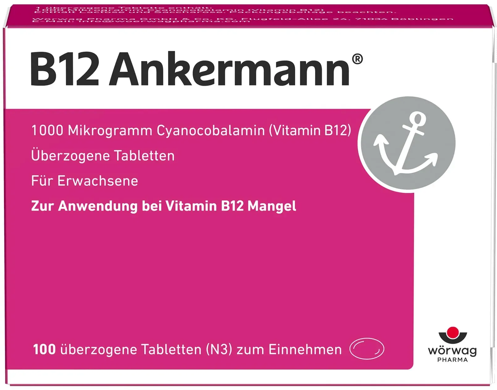 0,30 /St - Kategorie: Arzneimittel - Wörwag Pharma - GTIN:4150015027267 - PZN:01502726 - B12 Ankermann 100 St - rezeptfrei - von Wörwag Pharma GmbH & Co. KG - überzogene Tabletten - 100 St - 30,00 Euro bei DocMorris Apotheke - gefunden von billiger.de Diese 100er-Packung überzogener Tabletten bietet eine gute Menge für eine regelmäßige Einnahme. ![]() ![]() Wörwag Pharma B12 ANKERMANN überzogene Tabletten 100 St