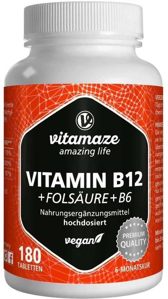 Zustand: Neu - 378,54 € / kg - Vitamin B12 Vitamin B12 Präparate - Vitactiv Natural Nutrition - - EAN: 4260408798558 - VITAMIN B12 HOCHDOSIERT: Das Supplement enthält hochkonzentrierte 500 µg Vitamin B12 in Form des hochwertigen Methylcobalamin Vit B12. 180 vegane Tabletten für 180 Tage Vitamin B12 Kur und Alltag! HOHE BIOVERFÜGBARKEIT: Das in unseren Vitamin B-12 Tabletten enthaltene Methylcobalamin ist die aktivste Coenzym-Form des Vitamins B12. Es kann ohne Umwandlung direkt im Körper verwertet werden. B12 VEGAN - FÜR WEN? Unsere vegane Nahrungsergänzung mit B12 Vitamin ist stark für Jung & Alt. Prima für Menschen über 50. Mittel für Veganer & Vegetarier, um ihr Vitamin-B12 Depot aufzufüllen. GEGEN MÜDIGKEIT & MEHR! Plagt dich Erschöpfung? Vitamin B12 kann Ermüdung verringern. Es unterstützt den Energie-Stoffwechsel, das Nervensystem, die psychische Funktion und das Immunsystem. Test it! LABORGEPRÜFTE QUALITÄT: B12 Präparate bzw. Nahrungsergänzungsmittel nach höchsten Qualitätsstandards in EU produziert. Ohne Magnesiumstearat & Gentechnik. Jede Charge in deutschem Institut geprüft. - Verkäufer: FeelGood Shop im amazon.de Marketplace Dieses Vitamaze-Produkt enthält zusätzlich Vitamin B9 und B6, was eine umfassendere B-Vitamin-Versorgung ermöglicht. ![]() ![]() Vitamaze Vitamin B12 1000 g hochdos.+B9+B6 vegan Tabletten 180 St