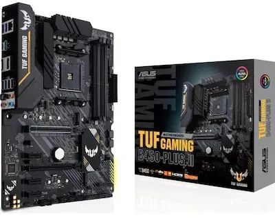 Kategorie: Mainboards - Asus - GTIN:4718017957489 - ATX Mainboard Sockel AM4 für AMD Ryzen, AMD A-Series AMD B450 Chipsatz, Grafik aus Ryzen CPU mit Vega Grafik 64 GB max. RAM, DDR4-2133,2400,2666 bis 4400(OC) M.2, USB3.2 (Gen2 Typ C+A), DVI, HDMI TUF Protection/Komponenten, Aura Sync LED Beleuchtung - 91,90 Euro bei Cyberport - gefunden von billiger.de Dieses Asus TUF Gaming Mainboard ist eine beliebte Wahl für Gamer, die ein robustes und funktionsreiches ATX-Board suchen. ![]() ![]() ASUS TUF GAMING B450-PLUS II (AM4, AMD B450, ATX), Mainboard
