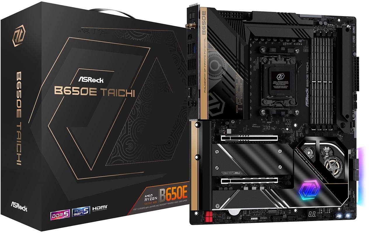 Kategorie: Mainboards - ASRock - GTIN:4710483943508 - Qualität/Haltbarkeit Langlebigkeit Robustheit Flexible Gestaltung - 830,15 Euro bei Amazon Marketplace CE - gefunden von billiger.de Das ASRock B650E Taichi ist ein Premium-Mainboard mit umfangreicher Ausstattung und ist für Enthusiasten gedacht, die keine Kompromisse eingehen wollen. ![]() ![]() ASRock B650E Taichi AMD B650 Socket AM5 Extended ATX