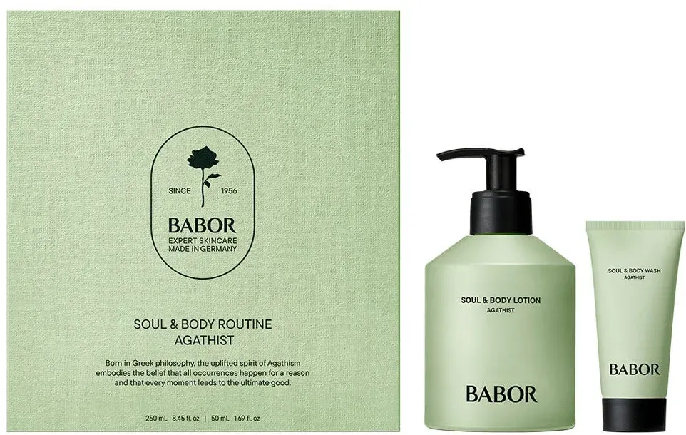 Zustand: Neu - 191,68 € / l - Raumdüfte - BABOR Dr. Babor GmbH & Co. KG - - EAN: 4015165370567 - Der Grounding Raumduft mit ätherischen Ölen aus Patchouli, Zedernholz, Bergamotte und Vetiver fördert Entspannung und Wohlbefinden. Zedernholz erdet, Patchouli sorgt für Leichtigkeit, während Vetiver und Bergamotte Gelassenheit bringen. Die sorgfältige Mischung ätherischer Öle bietet ein entspannendes Dufterlebnis und fördert das Wohlbefinden. Die alkoholfreie Formulierung sorgt bis zu sechs Monate für eine angenehme Atmosphäre. Tierversuchsfrei. Verschluss abschrauben und weiße Dichtscheibe von oben durch die Öffnung herausdrücken. Den Verschluss wieder vollständig auf den Flakon schrauben. Je nach gewünschter Duftintensität kann die Anzahl der Stäbchen variabel verwendet werden und durch den Verschluss in den Flakon geben. Raumduft standsicher auf eine waagerechte, stabile Oberfläche stellen, sodass der Inhalt nicht verschüttet werden kann. Die Sinne werden von dem wohltuenden Duft umhüllt, während in eine harmonische Entspannung eingetaucht wird. - bei Amazon.de Dieses Geschenkset bietet eine Kombination aus Body Lotion und Body Wash und ist ideal zum Ausprobieren oder Verschenken. ![]() ![]() BABOR Soul & Body Agathist Gift Set