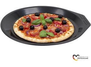 Küchenhelfer Wohnen Küchenutensilien - - Das hochwertig emaillierte chg Grill- und Pizzablech PRIMA mit praktischer Thermolochung, (ca. 36,0 x 33,0 x 2,0 cm) ist die deutlich leckerere Variante, wenn Sie köstliche Pizza mit knusprigem Boden genießen wollen: Statt ein mit Backpapier belegtes Blech in den Ofen zu schieben, empfehlen wir unser rundes Pizzablech mit cleverer Thermolochung. Ob in beeindruckender Pizzabäckermanier locker durch die Luft gewirbelt oder liebevoll aus der Tiefkühltruhe auf das Blech platziert, macht beim Geschmackserlebnis (fast) keinen Unterschied mehr: Die extra Portion Knusprigkeit spürt man beim ersten Bissen. Das Material Emaille besticht außerdem als wahrer Umweltheld: Die feste, glasartige und abriebbeständige Oberfläche ist kratz- und schnittfest und somit ein Garant für eine lange Nutzungsdauer. Speisereste lassen sich dank der glasartigen Oberfläche mit geringem Aufwand per Hand oder in der Spülmaschine aus der Form lösen. Unsere Emailleprodukte werden zudem in einem ressourcenschonenden Verfahren in Deutschland hergestellt, bei welchem ausschließlich von Natur aus unbedenkliche Stoffe Verwendung finden. Die hierfür erforderlichen Rohstoffe sind langfristig und in ausreichenden Mengen auf der Welt vorhanden. / Spülmaschinengeeignet, leicht zu reinigen / Geeignet für handelsübliche Backöfen, sowie für Gas-, Elektro- und Holzkohlegrills / Hitzebeständig bis 400°C / Made in Germany!, Maßangaben: Breite: 33 cm, Tiefe: 36 cm, Höhe Rand: 2 cm, ... Dieses emaillierte Pizzablech von Dr. Oetker verspricht eine hohe Lebensdauer und knusprige Ergebnisse. ![]() ![]() Dr. Oetker Backblech Emaille 42 x 29 cm BACK-IDEE, eckiges Pizzablech mit hoher Lebensdauer, für knusprige Pizza im Ofen, hitzebeständig & emailliert (Farbe: Schwarz), Menge: 1 Stück