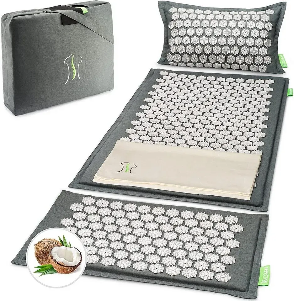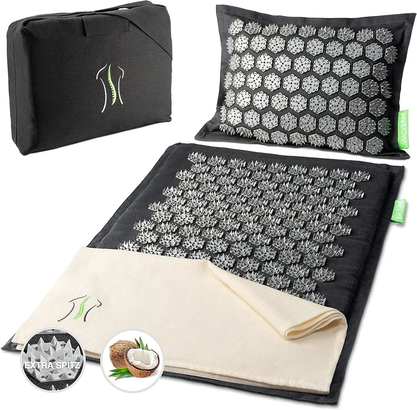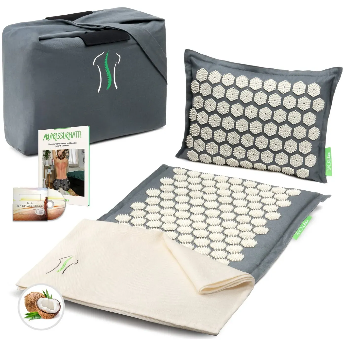 Auf Lager Versand durch AmazonBACKLAXX ® Akupressurmatte mit Kissen, Tuch und Tasche, Akupunktur Matte mit Stacheln zur Massage und Entspannung von Nacken und Schulter, Massagematte Rücken (grau) zur Akupressur
